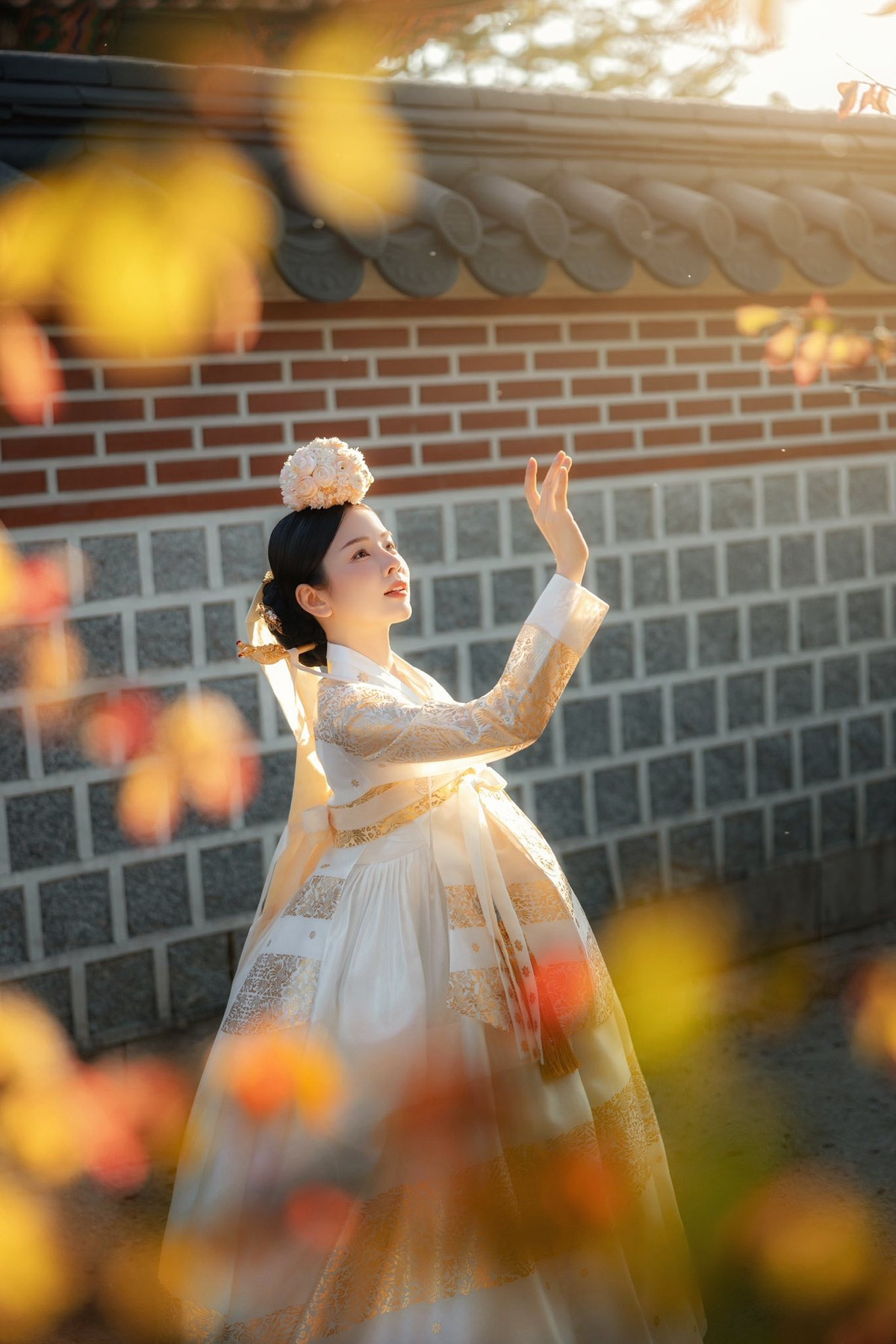 Bối cảnh kiến trúc cổ kính với tường đá rêu phong, mái ngói truyền thống và những tán cây lá vàng rực rỡ đã tái hiện hoàn hảo không gian lãng mạn của mùa thu xứ Hàn. (Ảnh: IGNV)