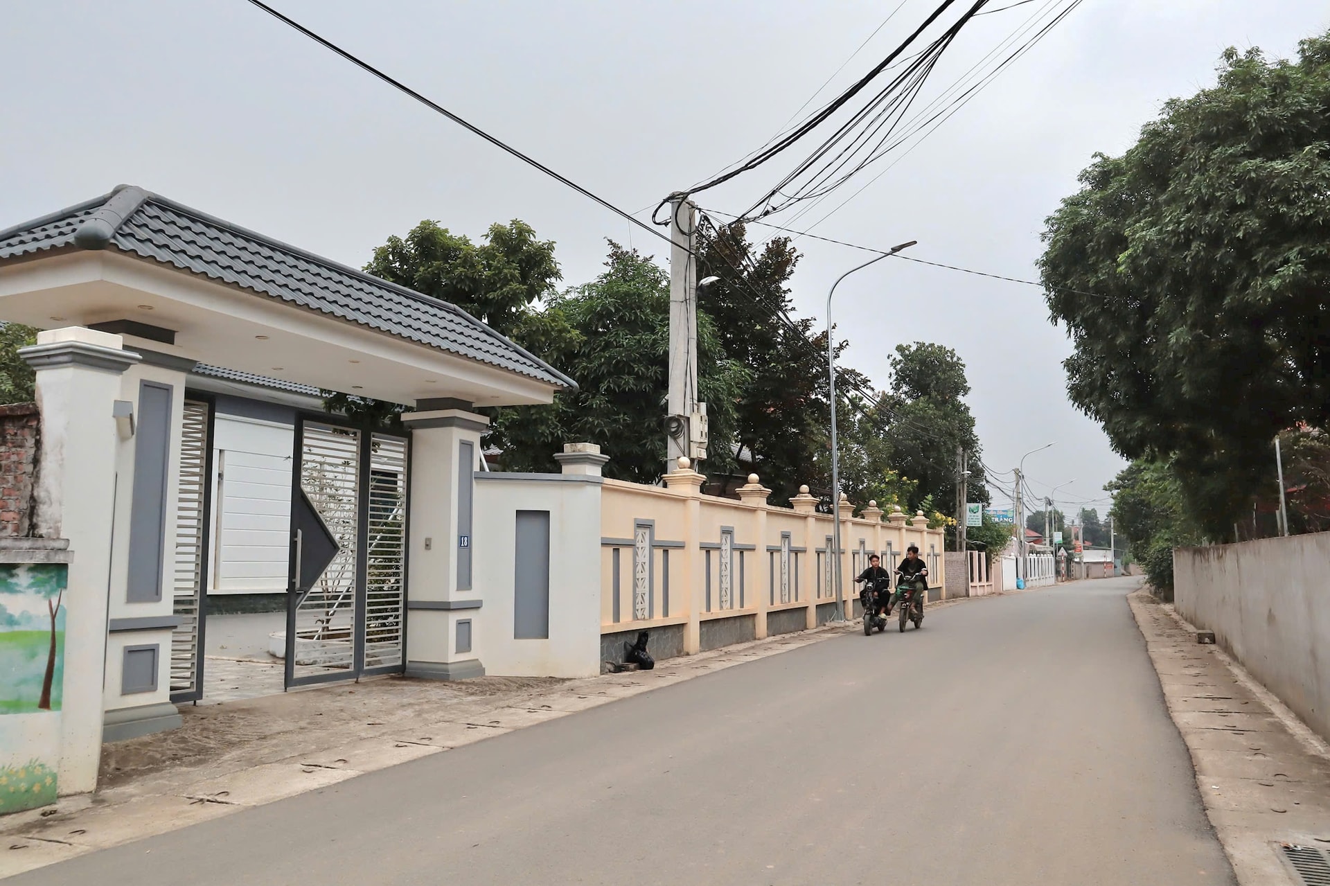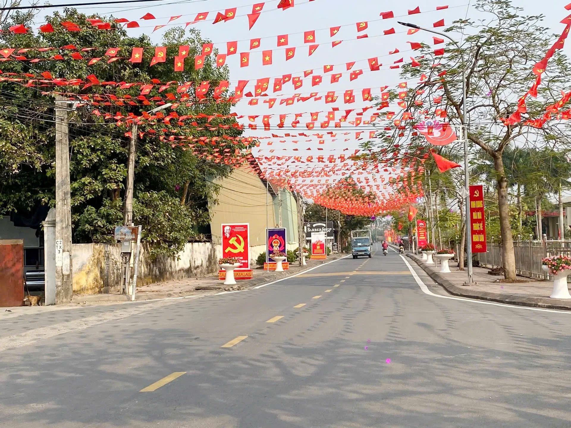 Góc làng quê khang trang, rực rỡ cờ hoa chào mừng Đại hội Đảng toàn quốc lần thứ XIV tại xã Liên Minh. Ảnh: Thắng Văn