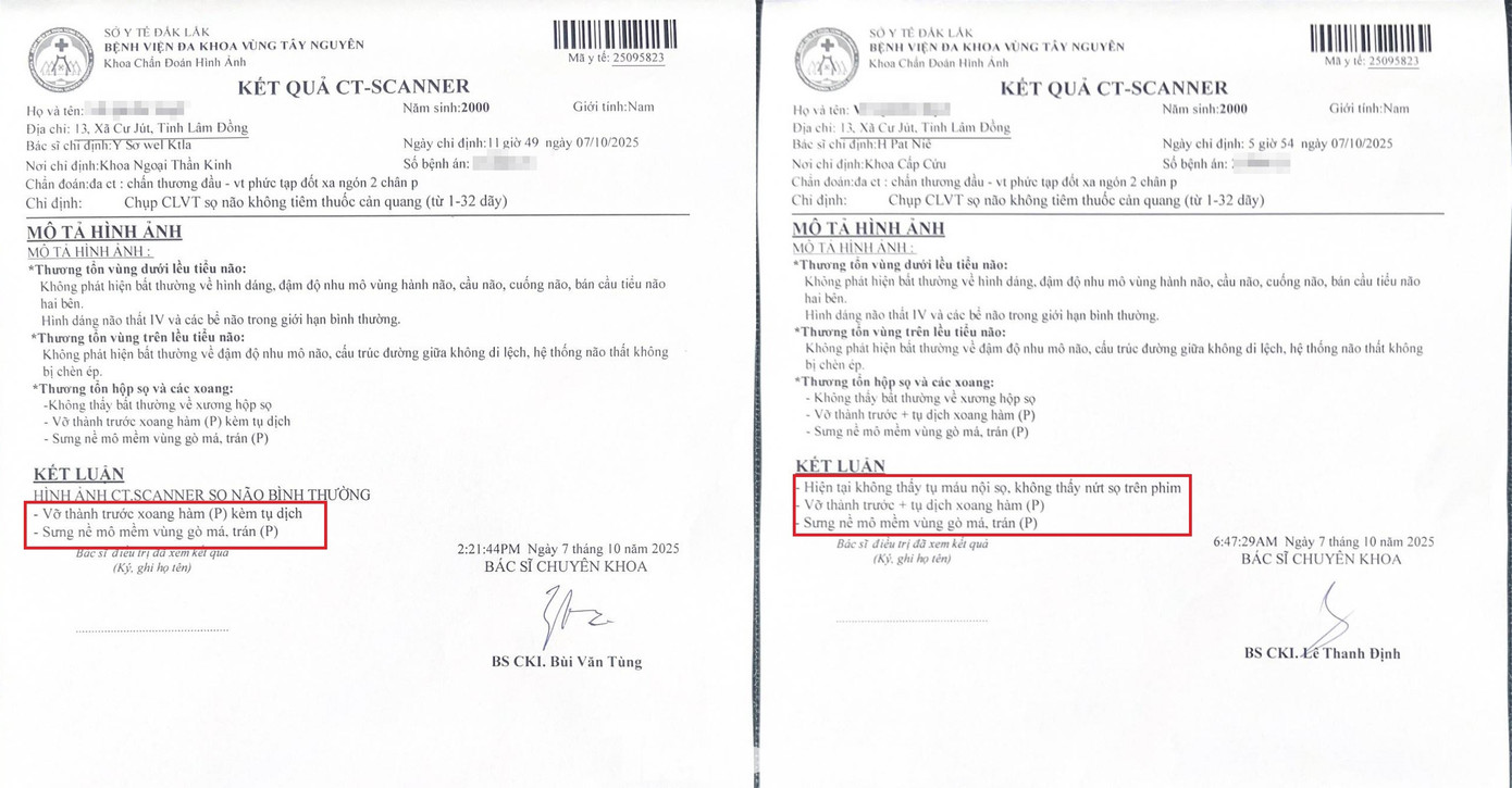 Sau khi về nhà, anh Đ. vẫn còn lơ mơ, đau đầu và mất trí nhớ tạm thời nên ngày 13/10, gia đình đưa đến một bệnh viện tư ở Đắk Lắk kiểm tra. Kết quả CT thể hiện anh Đ. bị vỡ thành trước xoang hàm phải, tụ máu xoang, mảnh xương rời nhỏ cạnh xương mũi và sưng nề vùng má, mắt phải.