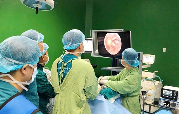 Các bác sĩ Bệnh viện Đà Nẵng thực hiện ca phẫu thuật nội soi cột sống hai cổng (UBE) cho cụ bà Ngô Thị H.N.