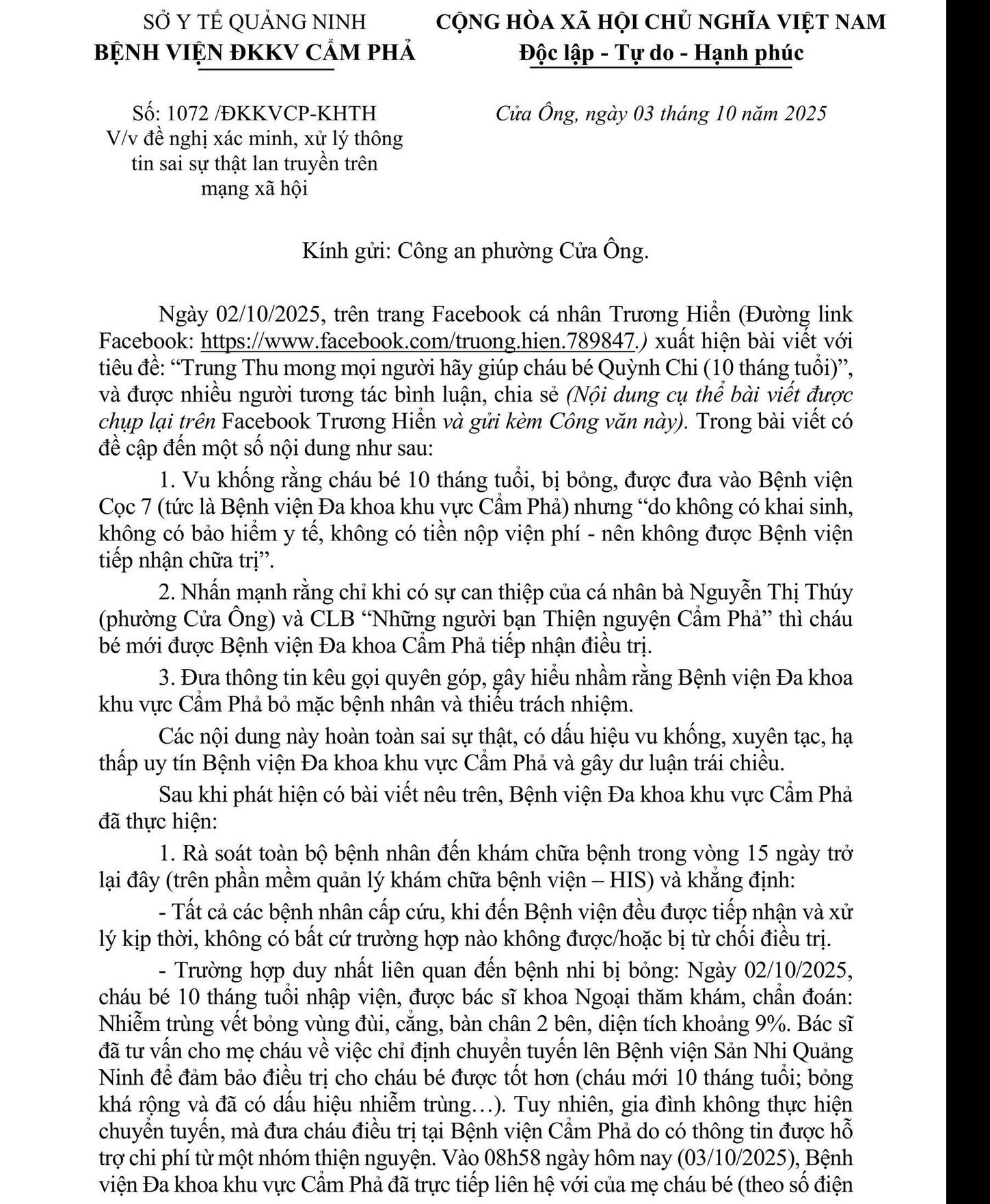 Bệnh viện Đa khoa khu vực Cẩm Phả ban hành công văn gửi cơ quan công an về việc đề nghị xác minh, xử lý thông tin sai sự thật lan truyền trên mạng xã hội. Ảnh: BVCC.