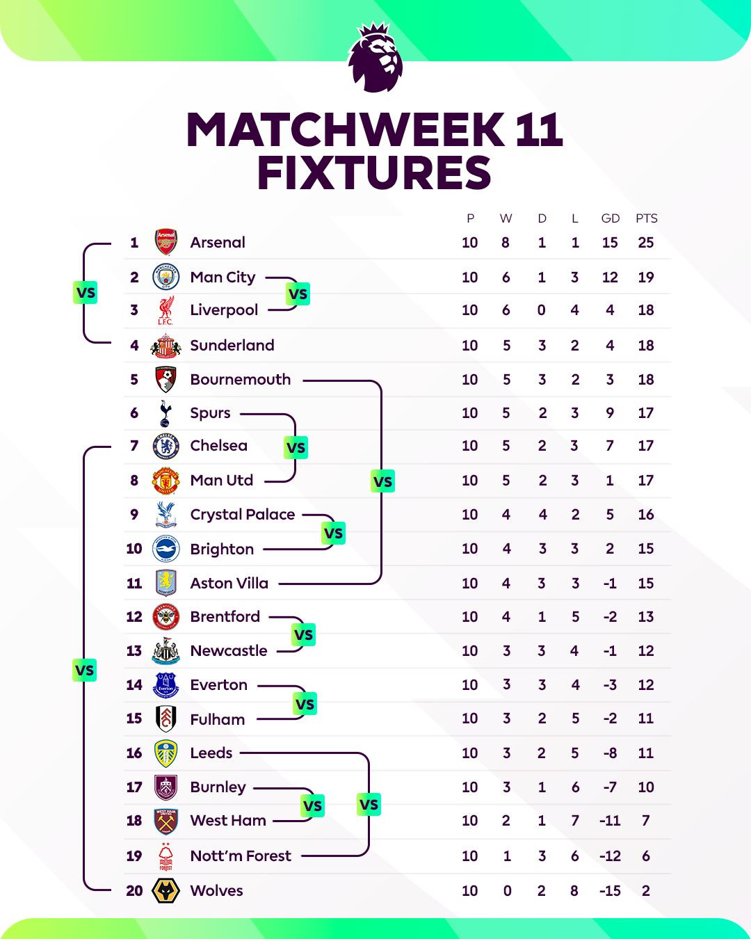 Bảng xếp hạng giải Ngoại Hạng Anh 2025-2026 vòng 11 mới nhất