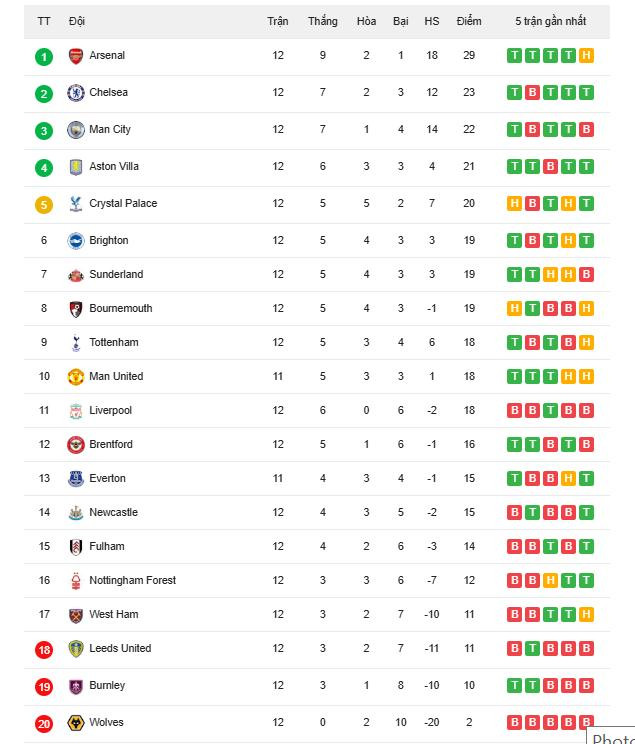 Bảng xếp hạng giải Ngoại Hạng Anh 2025-2026 vòng 12 mới nhất