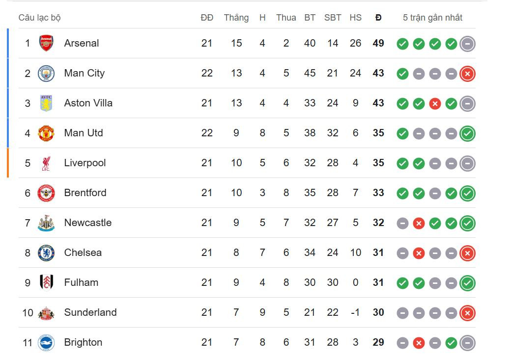 BXH Ngoại hạng Anh 2025/26 - Vòng 22 mới nhất: MU vọt lên top 4