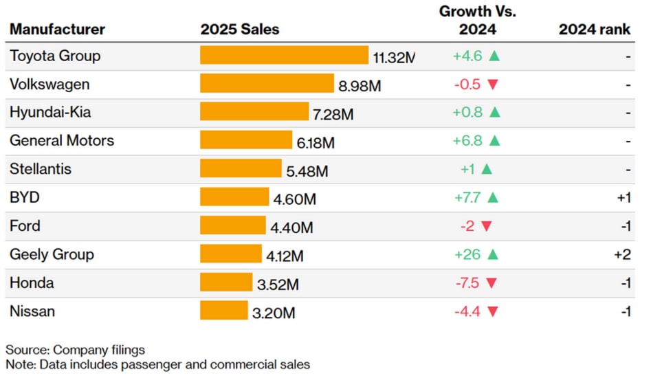 Ở nhóm dẫn đầu, tập đoàn Toyota tiếp tục khẳng định vị thế thống trị năm thứ sáu liên tiếp. Doanh số toàn cầu của hãng xe Nhật Bản tăng 4,6%, đạt mức 11,3 triệu chiếc, bỏ xa các đối thủ trong danh sách.