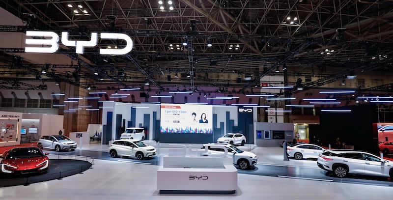 Gian hàng BYD trong buổi họp báo tại Japan Mobility Show 2025.