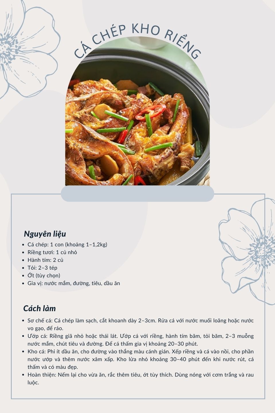 Điểm nhấn làm nên nét riêng của món cá chép kho chính là riềng. Riềng tươi khi giã hoặc xắt lát sẽ tỏa mùi thơm cay nhẹ, vừa giúp khử mùi tanh của cá, vừa làm vị kho trở nên thấm hơn. Ngoài riềng, hỗn hợp gia vị kho còn có nước mắm, tiêu, hành tím, tỏi và nước thắng màu. Cá được ướp kỹ trong khoảng 30 phút để thịt thấm vị trước khi kho.