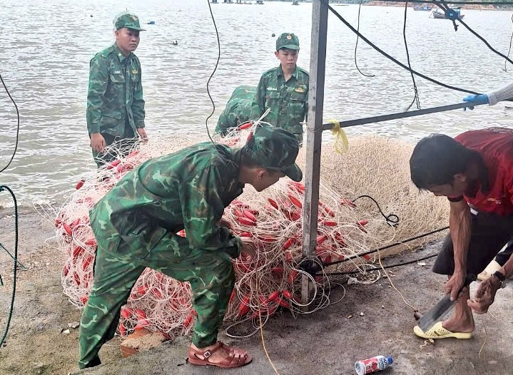 Bộ đội Biên phòng hỗ trợ ngư dân làng chài Hải Minh trước bão.