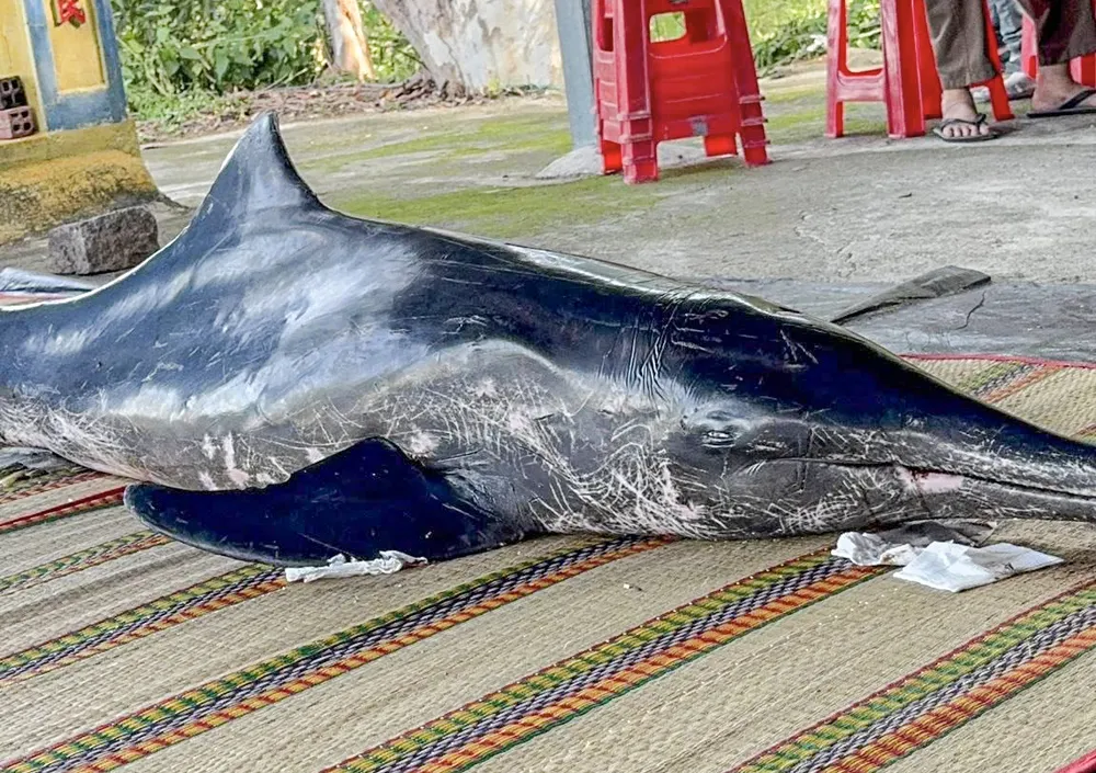 Tuy nhiên, sức khỏe của con cá heo hiện rất yếu, không thể tự bơi, người dân đã đưa con cá heo về lăng Ông ở thôn Nước Ngọt.