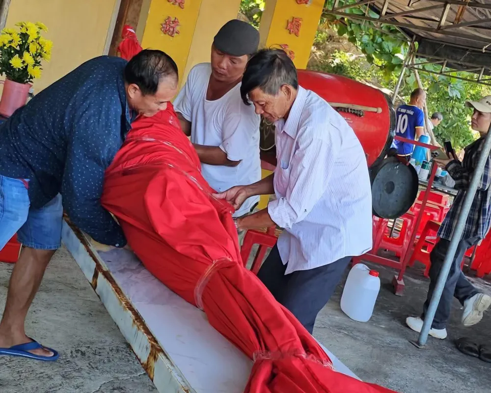 "Đến chiều hôm qua sức khỏe cá heo rất yếu, không thể tự bơi mà trôi theo con sóng. Sau khi bàn bạc, mọi người quyết định đưa cá về lăng Ông ở thôn để trông coi, tránh cá bị sóng đánh mất xác"- một người dân ở thôn Nước Ngọt cho hay.