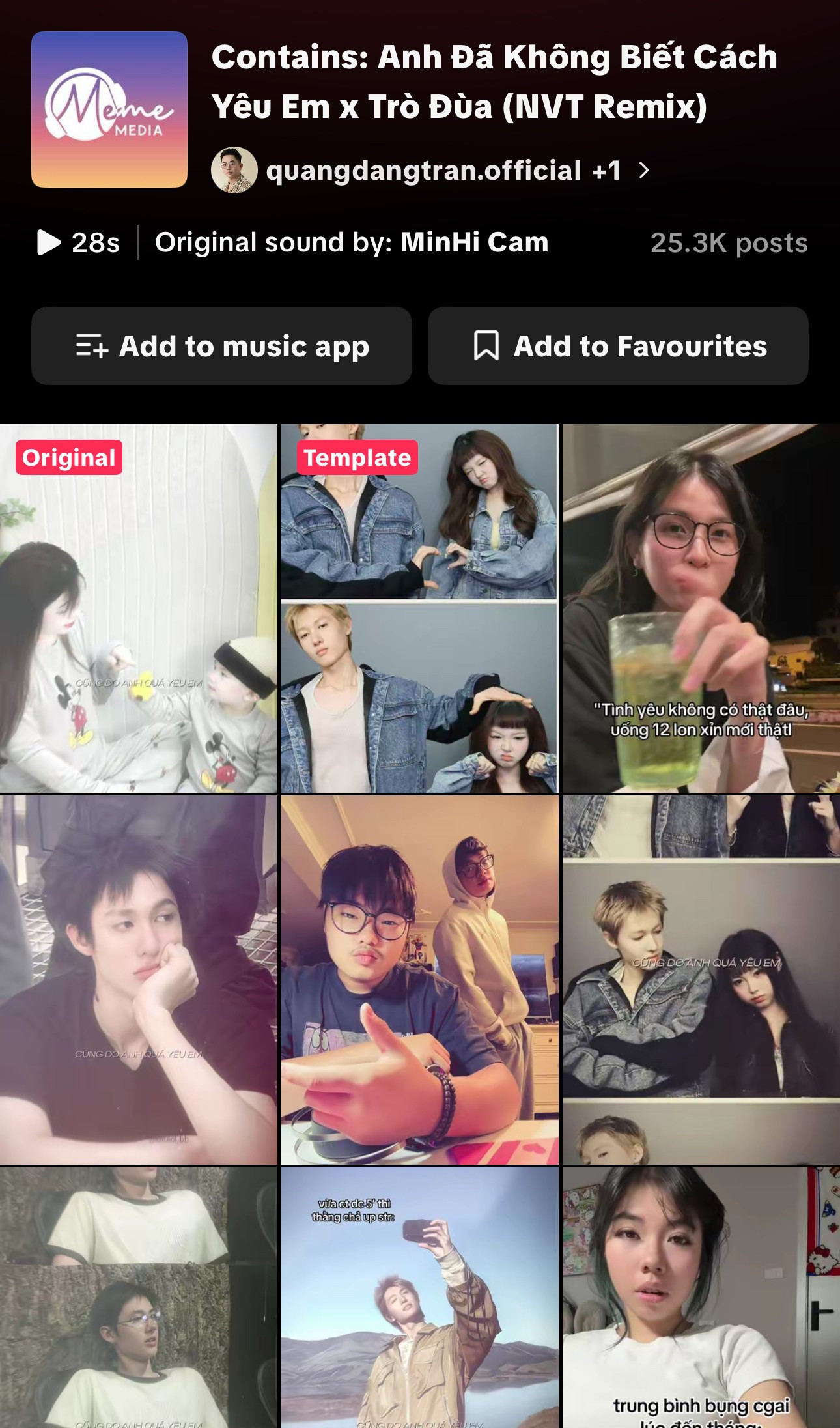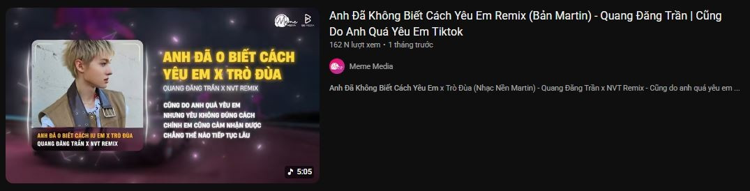 Dù đã chạm đến tháng cuối cùng của năm 2025 nhưng mạng xã hội TikTok vẫn đón chào một ca khúc mới trở thành xu hướng. Trong thời gian qua, Anh Đã Không Biết Cách Yêu Em của ca sĩ Quang Đăng Trần bất ngờ trở thành "cơn sốt", sở hữu giai điệu buồn man mác nhưng được không ít cư dân mạng đặt làm nền cho video của mình. Theo thống kê từ TikTok, Anh Đã Không Biết Cách Yêu Em đã được sử dụng làm nhạc nền cho hơn 25 nghìn video chỉ trong vài tháng qua, đặc biệt là với phiên bản remix sôi động.