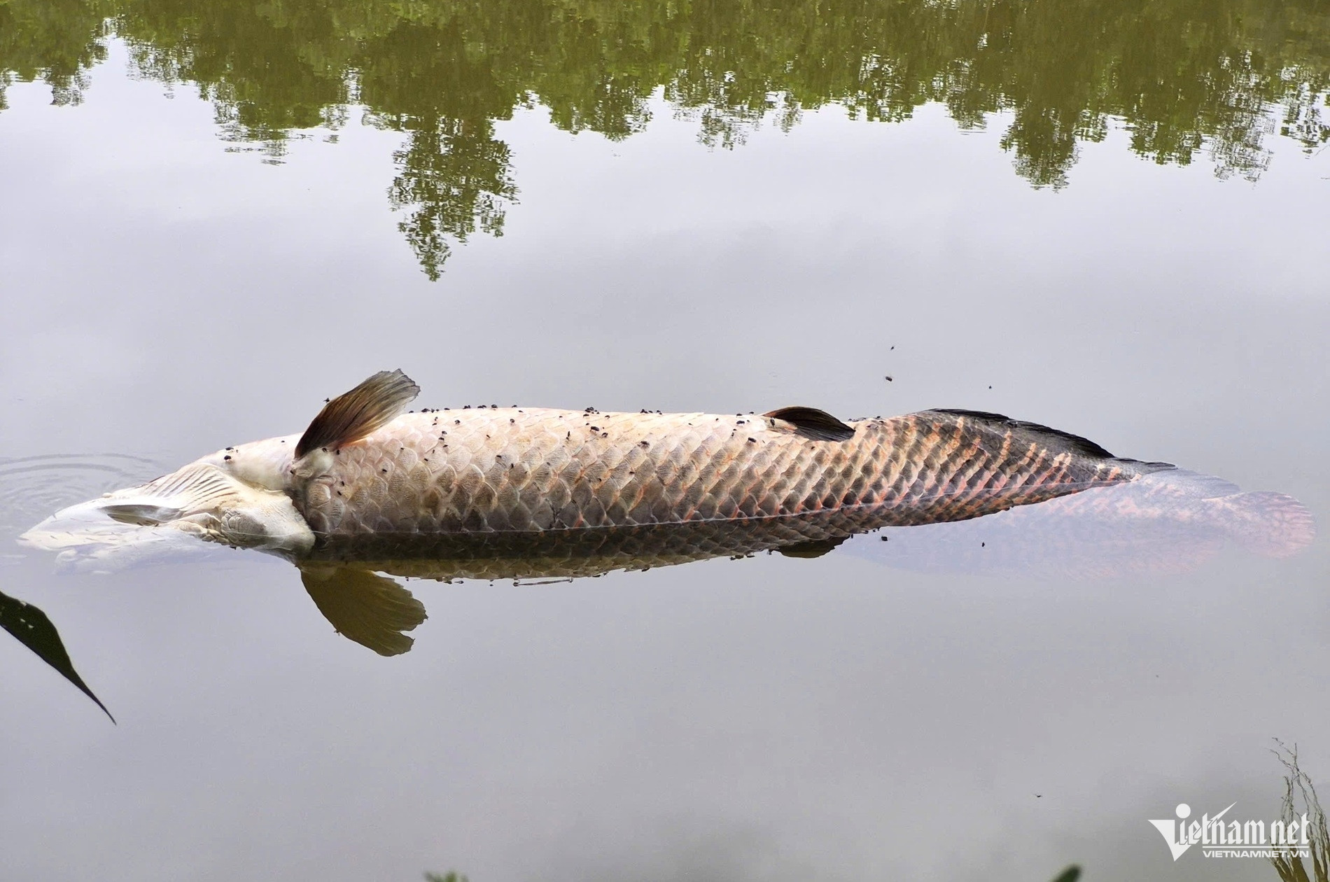Cá thể còn lại nổi lềnh bềnh trên mặt hồ được cho là đã chết từ 1-2 ngày trước, xuất hiện mùi hôi và ruồi nhặng bâu quanh.