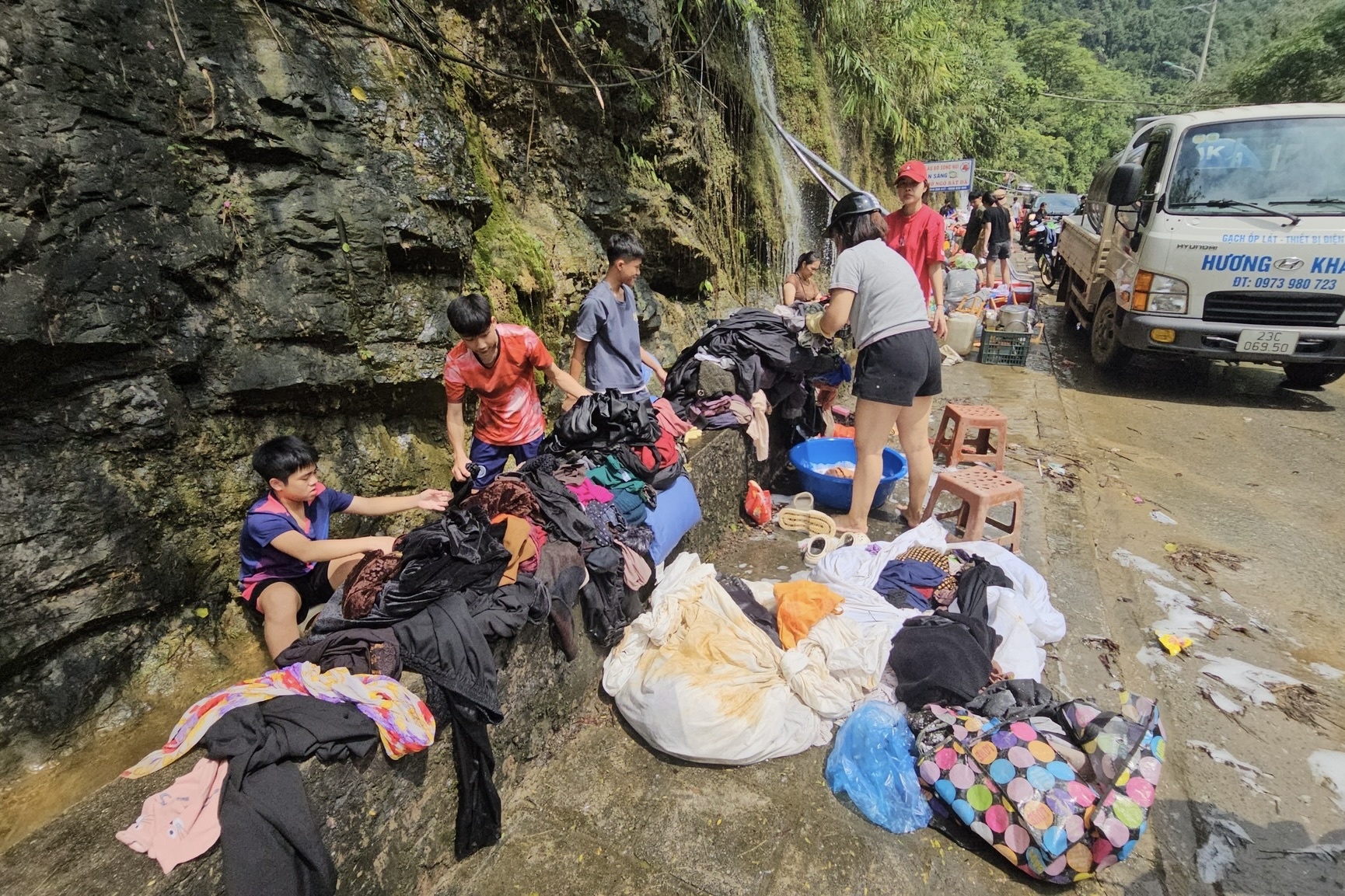 Cảnh người dân Tuyên Quang kéo nhau giặt giũ, tắm táp bên suối sau bão Ngày 3/10, mực nước tại phường Hà Giang 1, Hà Giang 2 rút dần. Nhiều hộ gia đình túa ra con suối cạnh đường Nguyễn Văn Linh để giặt giũ, hong khô quần áo, nhận đông đảo sự quan tâm từ cộng động mạng.