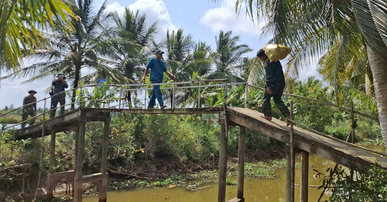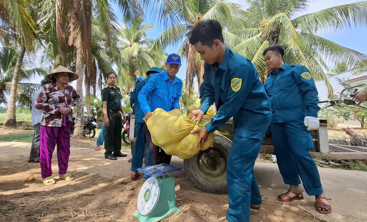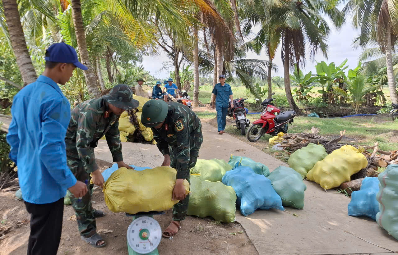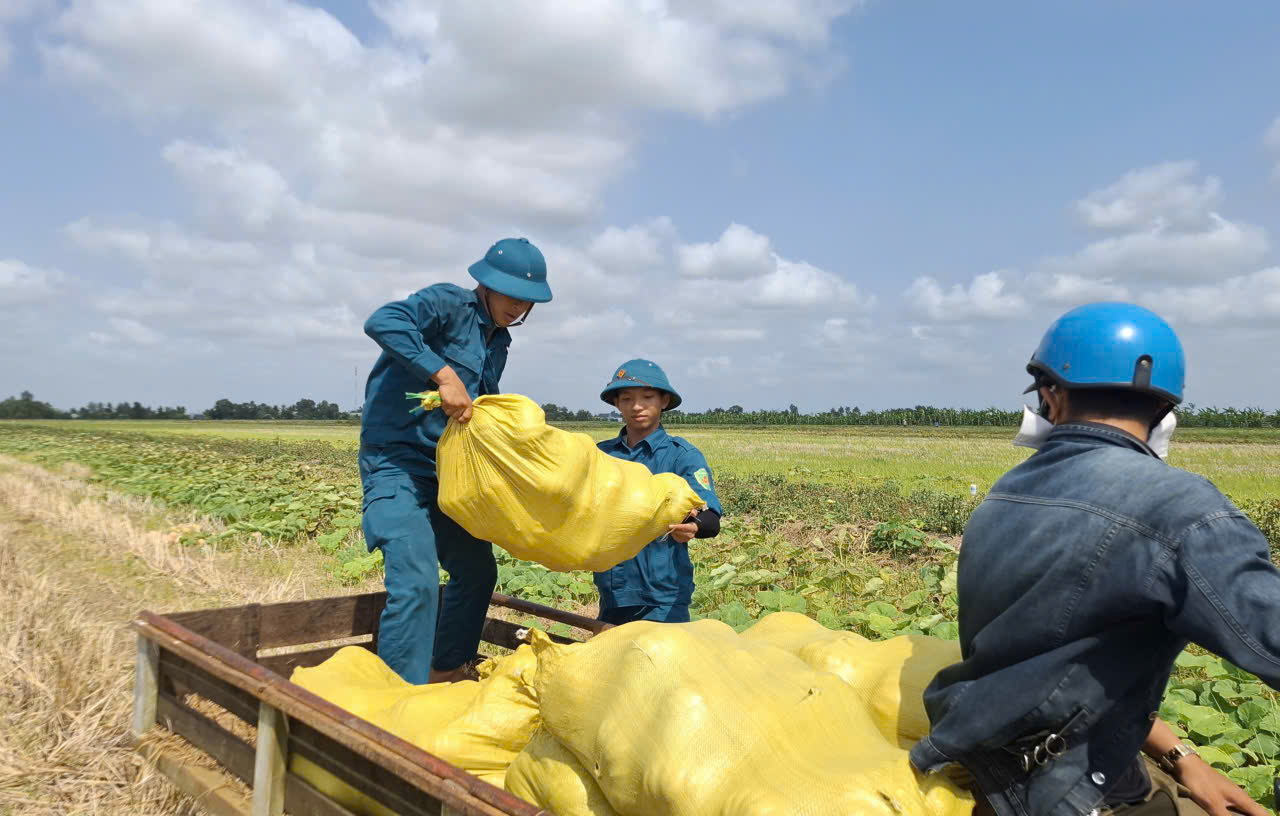 Lực lượng xã đội Khánh Bình hỗ trợ người dân thu hoạch và tiêu thụ bí đỏ