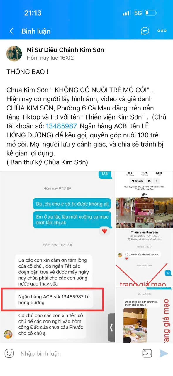 Trước đó, trên một số mạng xã hội như Facebook, Tiktok… xuất hiện tài khoản tên “Thiền viện Kim Sơn”, đăng tải hình ảnh nhiều trẻ em, với thông tin Chùa Kim Sơn đang nuôi dưỡng hơn 100 trẻ em mồ côi, kèm thông báo kêu gọi quyên góp tiền nuôi các em nhỏ.