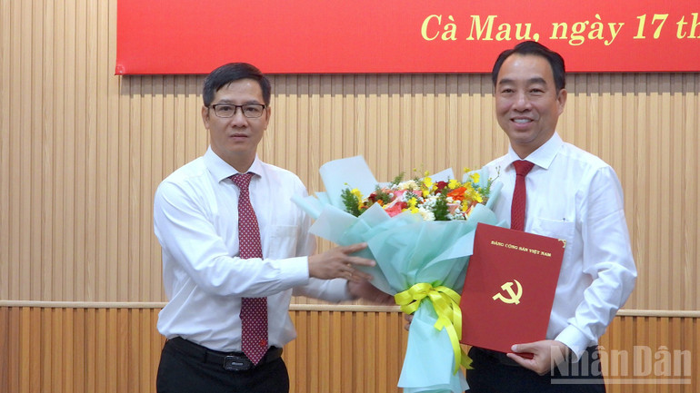 Bí thư Tỉnh ủy Cà Mau Nguyễn Hồ Hải (bên phải) chúc mừng đồng chí Lữ Quang Ngời tiếp nhận nhiệm vụ mới trong Ban Thường vụ Tỉnh Cà Mau.