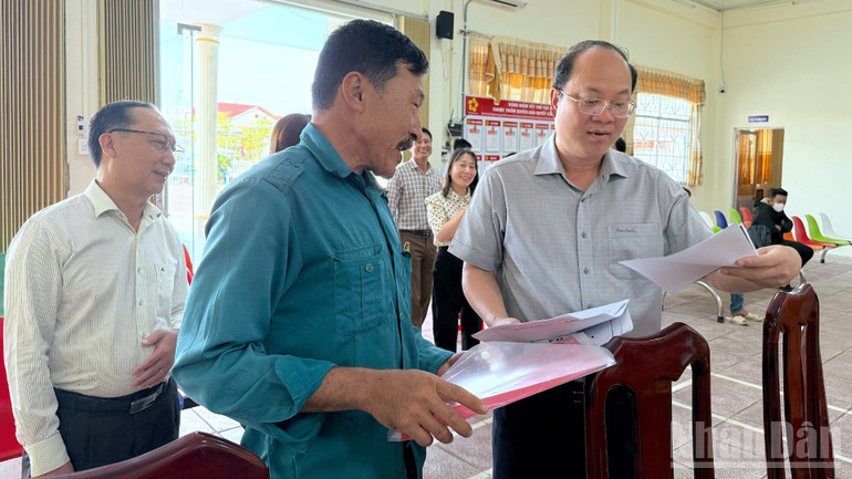 Bí thư Tỉnh ủy Cà Mau Nguyễn Hồ Hải (bìa phải) trao đổi với công dân đến Trung tâm Phục vụ hành chính công xã Trí Phải.
