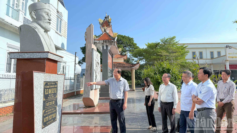 Bí thư Tỉnh ủy Cà Mau Nguyễn Hồ Hải (đứng trên cùng), cùng đoàn công tác tham quan, tìm hiểu các bia, tượng và nhà ghi danh liệt sĩ tại khuôn viên Trung tâm Phục vụ hành chính công xã Trí Phải.