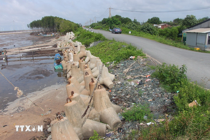 Một đoạn sạt lở đê biển được gia cố lại bằng kè chắn sóng. (Ảnh: Chanh Đa/TTXVN)