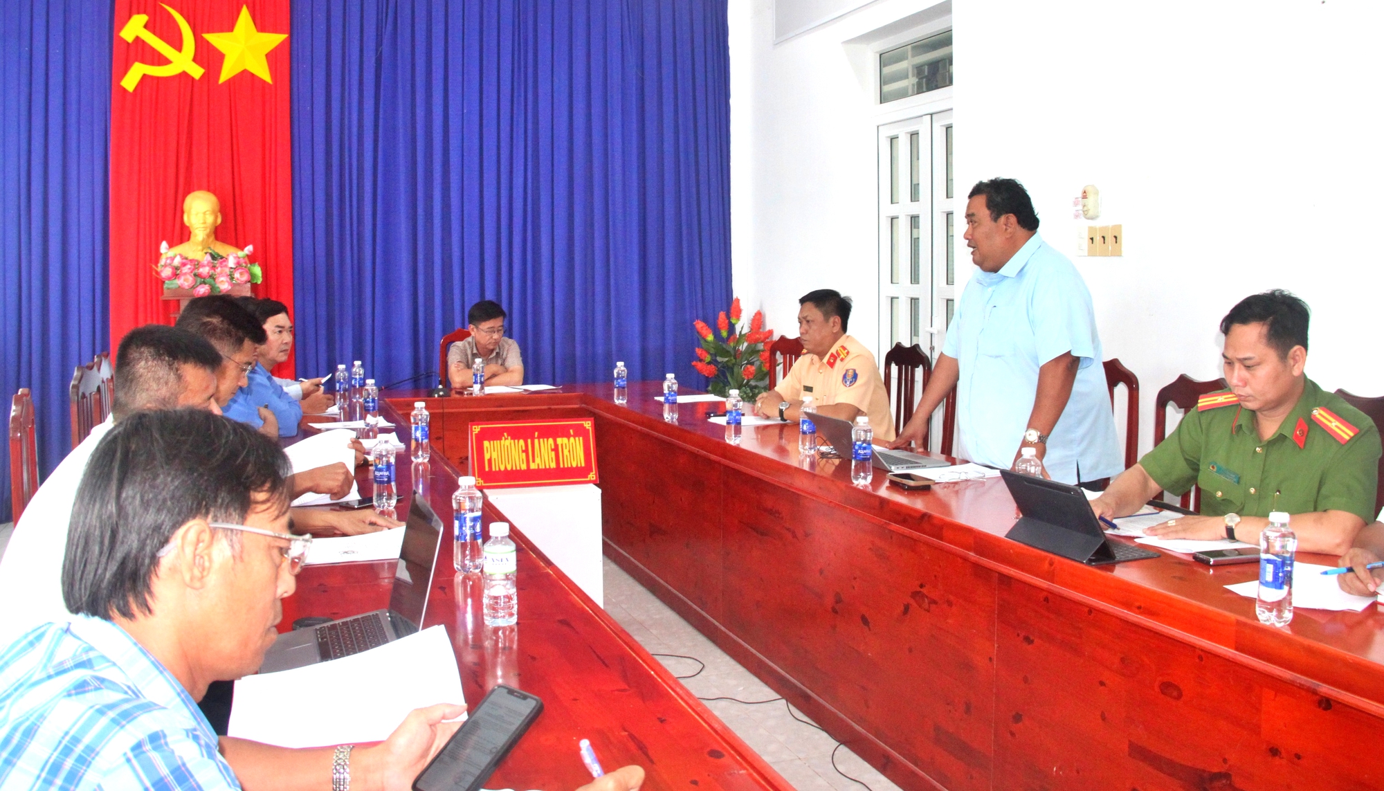 Ông Nguyễn Thanh Bằng, Chánh văn phòng Ban An toàn giao thông tỉnh Cà Mau trao đổi với các đơn vị và địa phương về giải pháp đảm bảo an toàn giao thông trên tuyến QL1, đoạn qua phường Láng Tròn.