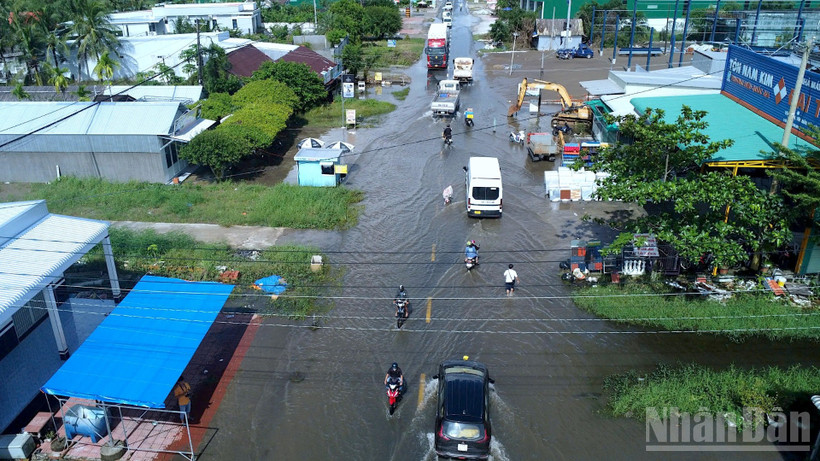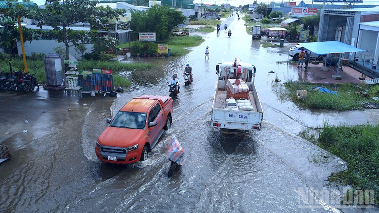 Tuyến Quốc lộ 1A, đoạn gần cầu Lương Thế Trân, tỉnh Cà Mau bị ngập sâu vào đợt mưa lớn kết hợp triều cường vào cuối tháng 10/2025.