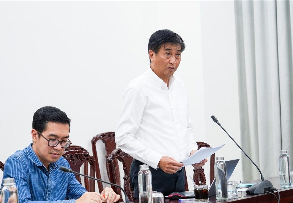 Ông Biện Quốc Nhu - Chủ tịch Hội đồng quản trị Công ty Cổ phần Tôm Miền Nam - báo cáo tại buổi làm việc với đồng chí Hồ Thanh Thủy - Phó Bí thư Tỉnh ủy Cà Mau ngày 07/11. Ảnh: ST