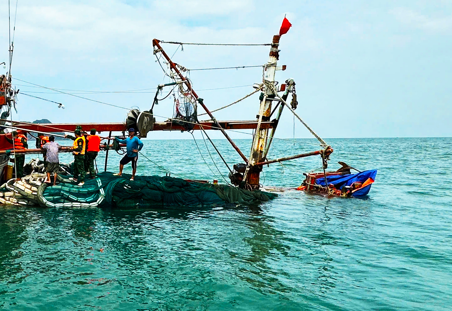 Lực lượng cứu hộ tiếp cận tàu cá bị chìm trên biển. Ảnh: HOÀNG TÁ
