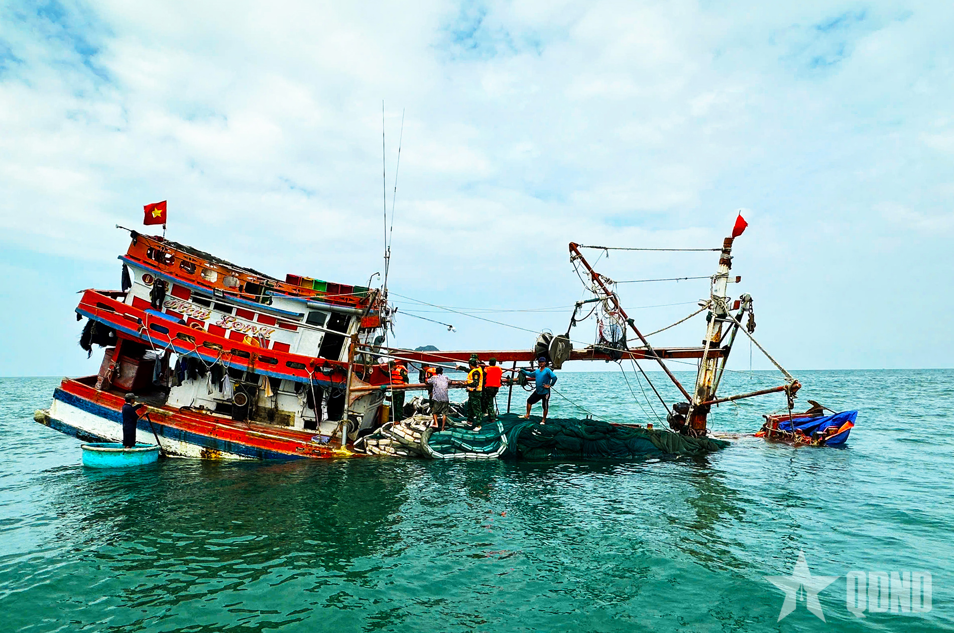 Lực lượng cứu nạn tiếp cận tàu cá bị chìm.