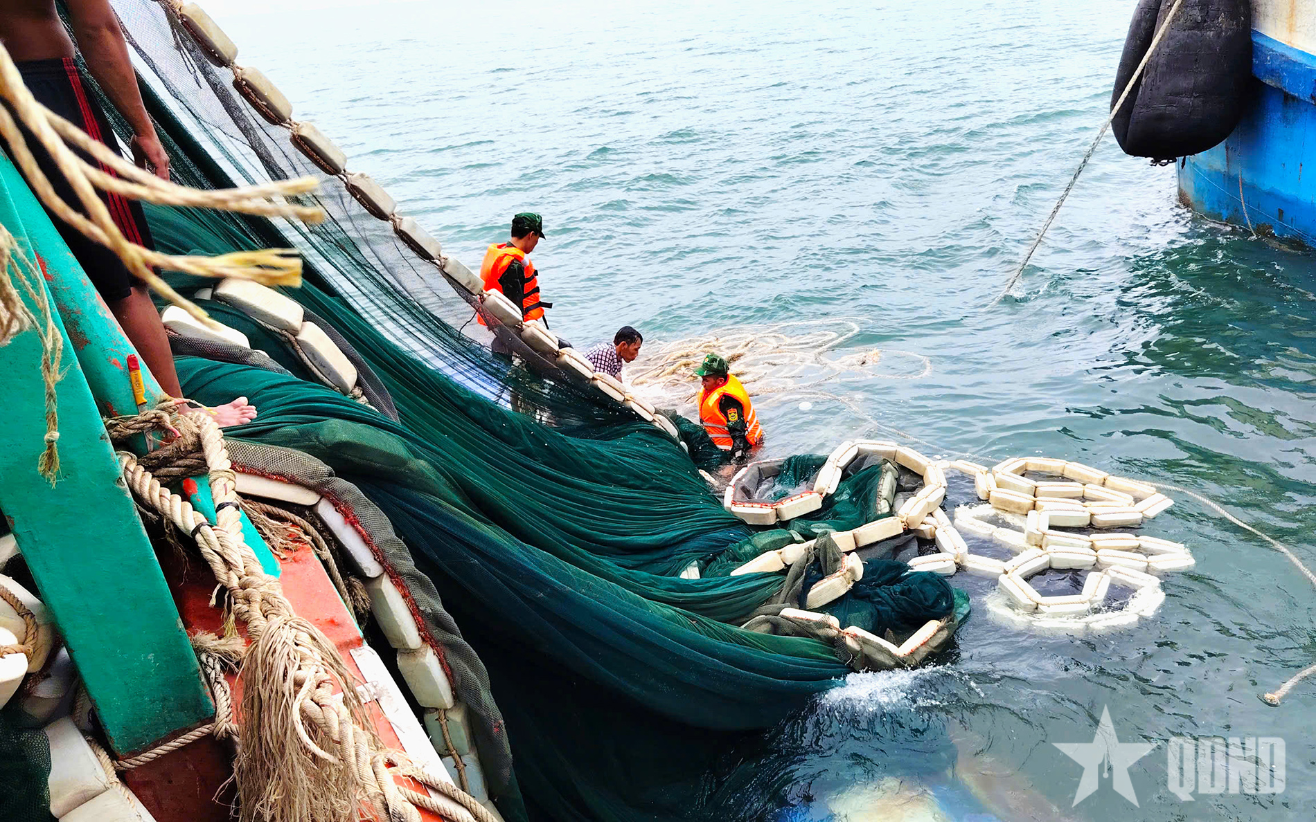 Cán bộ, chiến sĩ Đồn Biên phòng Hòn Chuối hỗ trợ trục vớt lưới đánh cá đưa lên tàu cứu nạn.