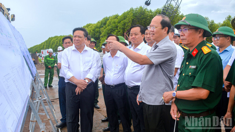 Ủy viên Trung ương Đảng, Bí thư Tỉnh ủy Cà Mau Nguyễn Hồ Hải (chỉ tay) kiểm tra tiến độ bàn giao mặt bằng phục vụ thi công cao tốc Cà Mau-Đất Mũi hồi tháng 10/2025.