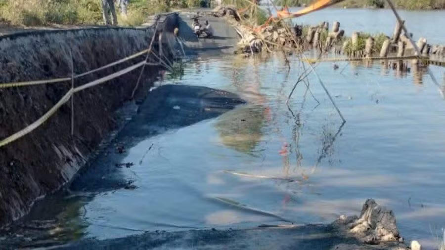 Đoạn đường mới nâng cấp, đưa vào sử dụng từ tháng 11/2024 tại xã Cái Nước bị sụp lún. Ảnh: Nguyên Du