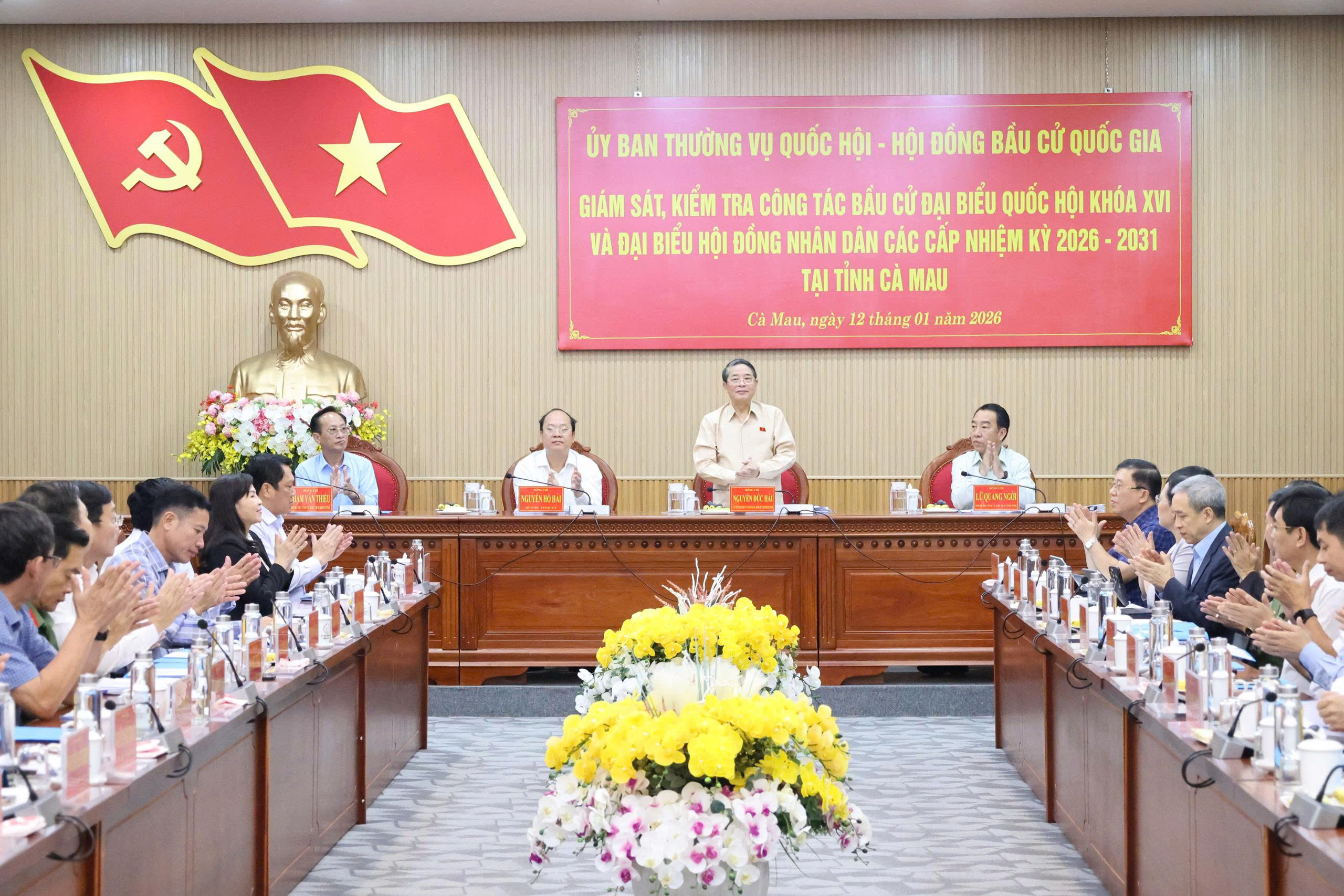 Ngày 12-1, Đoàn giám sát, kiểm tra công tác bầu cử của Ủy ban Thường vụ Quốc hội, Hội đồng Bầu cử quốc gia do đồng chí Nguyễn Đức Hải, Ủy viên Ban Chấp hành Trung ương Đảng, Phó Chủ tịch Quốc hội, Ủy viên Hội đồng Bầu cử quốc gia, làm trưởng đoàn, có buổi làm việc với tỉnh Cà Mau về công tác chuẩn bị bầu cử đại biểu Quốc hội khóa XVI và đại biểu HĐND các cấp nhiệm kỳ 2026-2031.