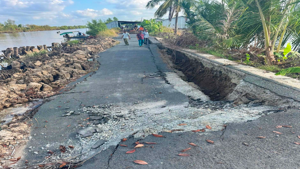 Hiện trạng đoạn đường bị sạt lở, sụt lún, gây chia cắt giao thông ở xã Cái Nước, tỉnh Cà Mau.