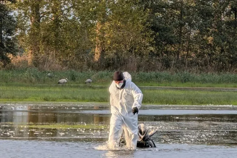 Nhân viên bảo tồn thu gom xác những con sếu hoang dã chết ở khu vực hồ Linumer trong đầm lầy Rhinluch (Đức). Ảnh: dpa