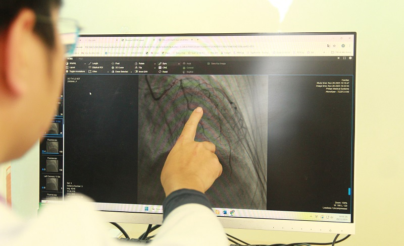 Khi tiếp nhận bà Đỗ Thị Lố, bác sĩ Đường nhận định đây là ca bệnh rất phức tạp. Điện tim cho thấy dấu hiệu tổn thương nhiều nhánh động mạch vành, men tim troponin T tăng cao trên 1.000 ng/L—gấp nhiều lần mức bình thường. Sau khi kích hoạt báo động đỏ, kíp can thiệp ngay lập tức tiến hành chụp mạch vành và phát hiện cả ba nhánh động mạch vành của bà đều hẹp nặng. Nhánh liên thất trước – "nhánh tối quan trọng" nuôi tim – là thủ phạm gây tắc cấp.