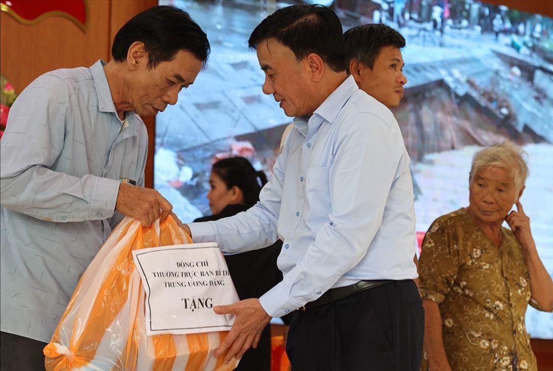 Thường trực Ban Bí thư Trần Cẩm Tú trao quà đến bà con xã Duy Nghĩa (TP Đà Nẵng) bị ảnh hưởng nặng nề do mưa lũ. Ảnh: TTXVN