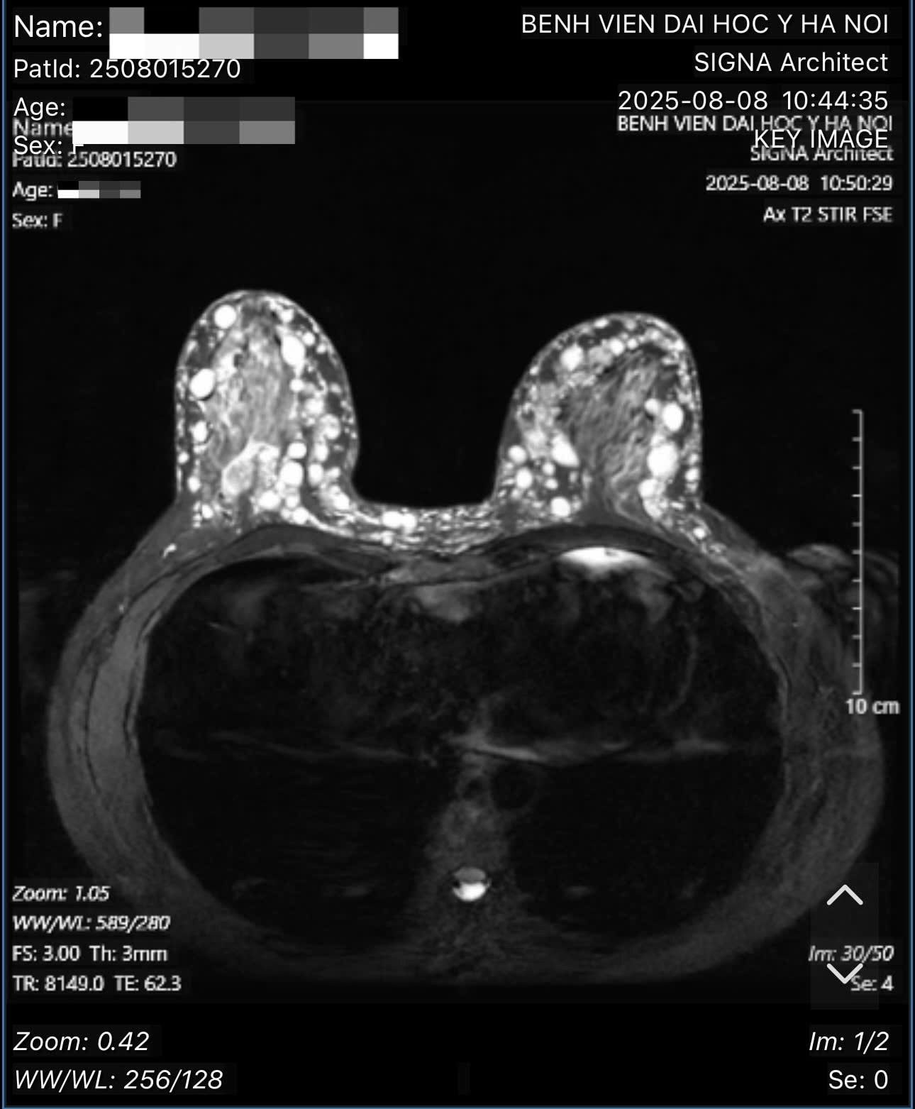 Bệnh nhân nữ, gần 50 tuổi, tới thăm khám tại Khoa Phẫu thuật tạo hình thẩm mỹ, Bệnh viện Đại học Y Hà Nội trong tình trạng khó chịu, đau nhiều ở vùng phía trên và phía trong của hai bên bầu ngực. Các cơn đau nhói xuất hiện thường xuyên khiến bệnh nhân rất khó chịu, sờ thấy rất nhiều cục lổn nhổn to nhỏ ở hai vú.