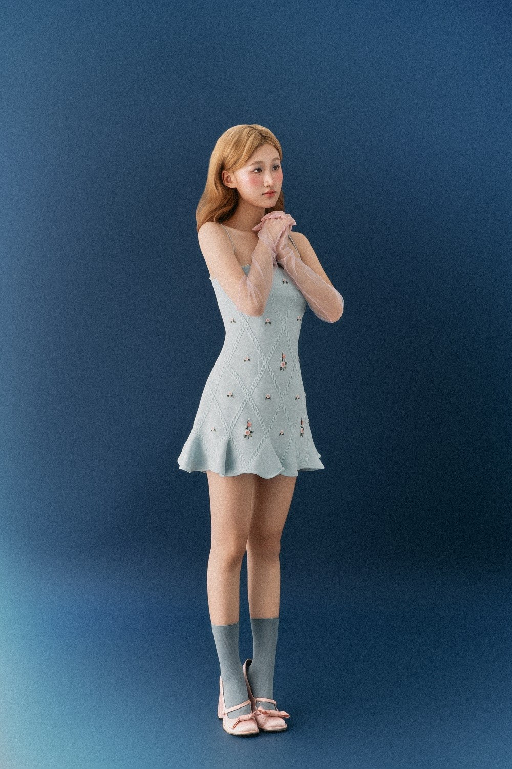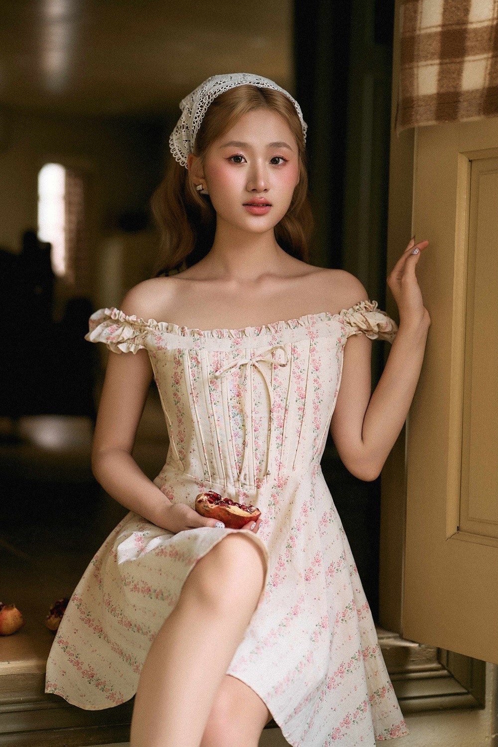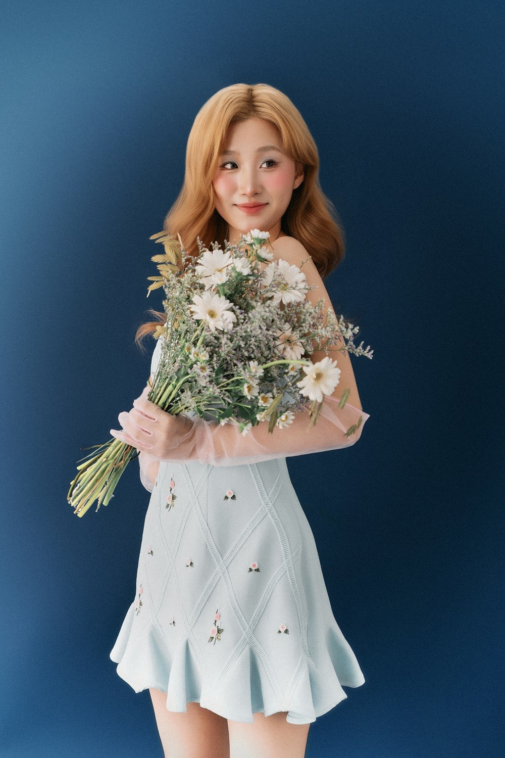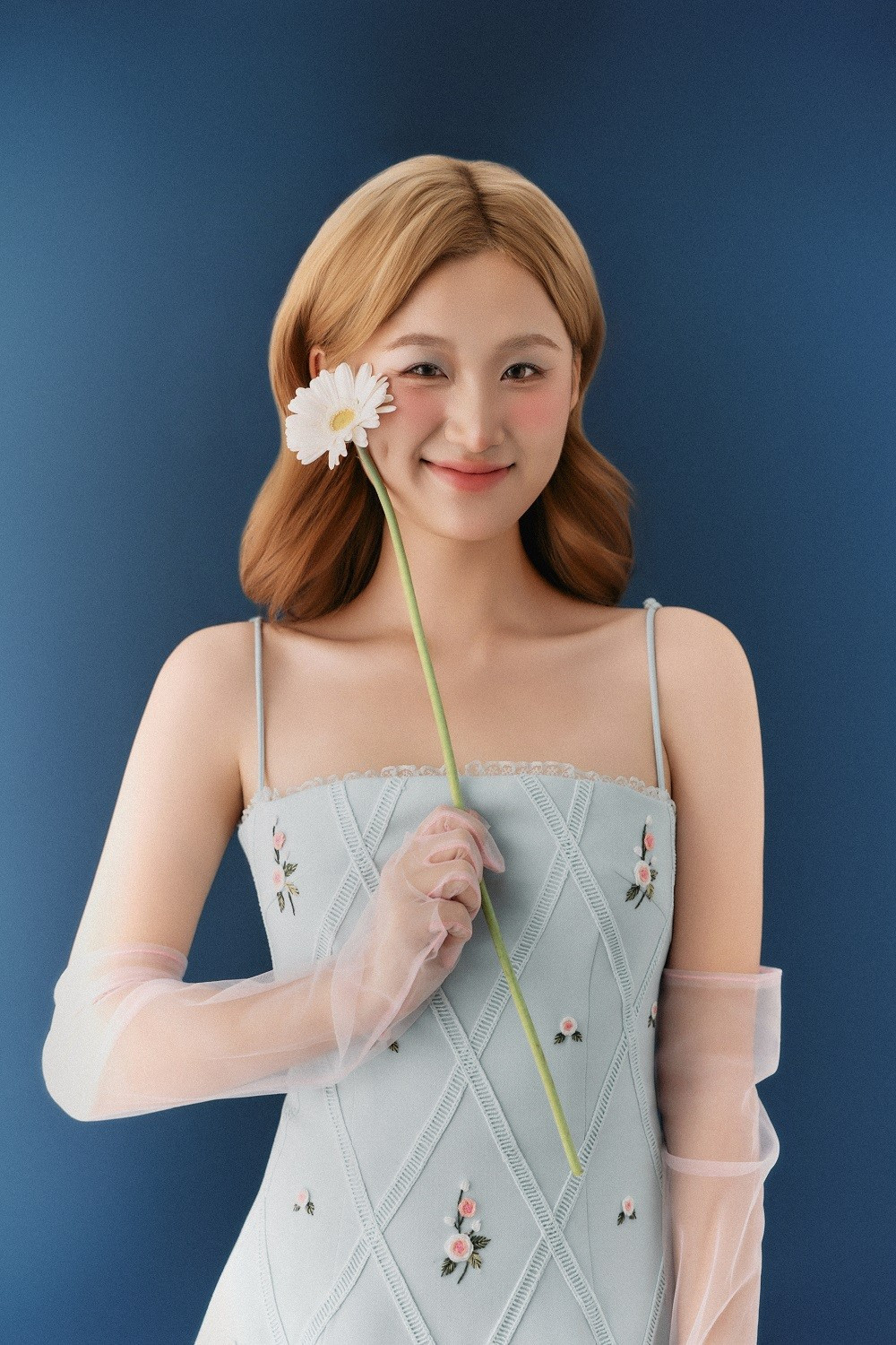 Trong bộ ảnh, XIRI lựa chọn những thiết kế váy đầm mang họa tiết hoa nhí tôn lên vẻ đẹp trong sáng, nàng thơ, tạo cảm giác vừa cổ điển vừa mơ màng. Ở một layout khác, XIRI xuất hiện với chiếc đầm xanh 2 dây pastel dịu mắt, tay cầm bó hoa cúc dại giản dị, thể hiện sự dịu dàng.