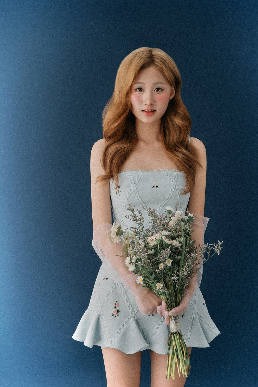 Phong cách trang điểm và làm tóc của XIRI cũng được chăm chút kỹ lưỡng, với mái tóc uốn xoăn nhẹ nhàng, điểm xuyết khăn ren trắng, góp phần tăng thêm nét nữ tính và sự tinh khôi cho tổng thể hình ảnh.