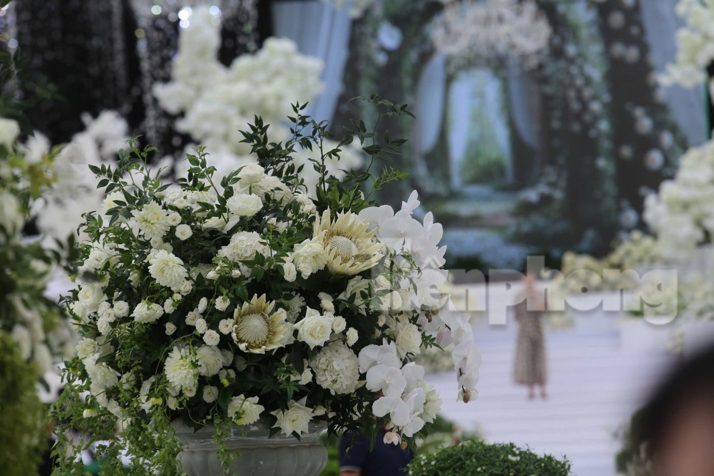 Không gian tiệc cưới được trang trí toàn bộ bằng hoa tươi với lối kiến trúc châu Âu.