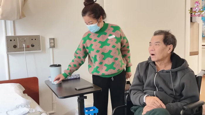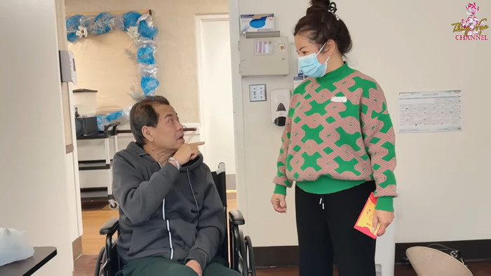 Nghệ sĩ Thúy Nga vào bệnh viện thăm hỏi sức khỏe của ca sĩ Quang Bình. (Ảnh chụp màn hình từ kênh YouTube Thúy Nga Channel)