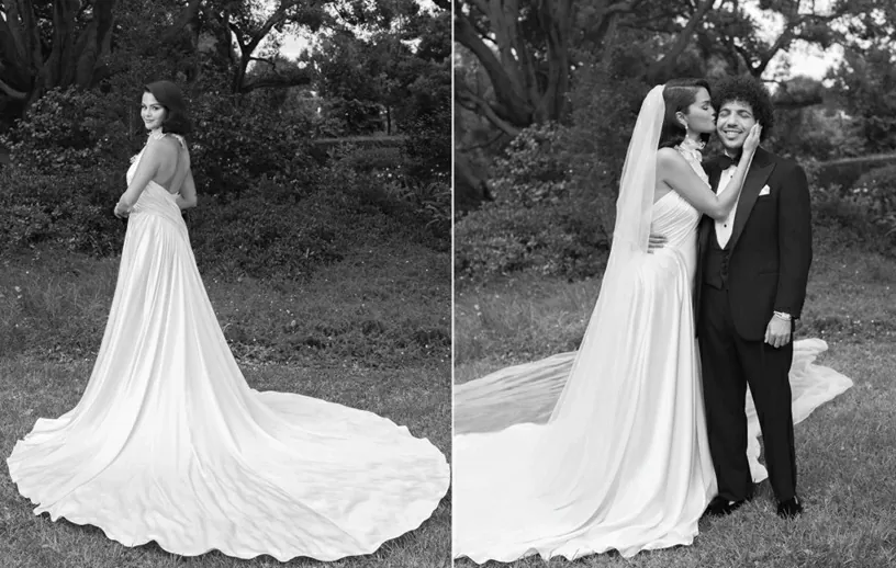 Selena Gomez diện váy cưới đuôi dài bồng bềnh, cổ yếm đính ren vừa sang trọng, vừa gợi cảm. Chú rể Benny Blanco, 37 tuổi, mặc tuxedo, thắt nơ đen phong cách truyền thống. Trang phục của cặp sao đều thuộc thương hiệu Ralph Lauren.