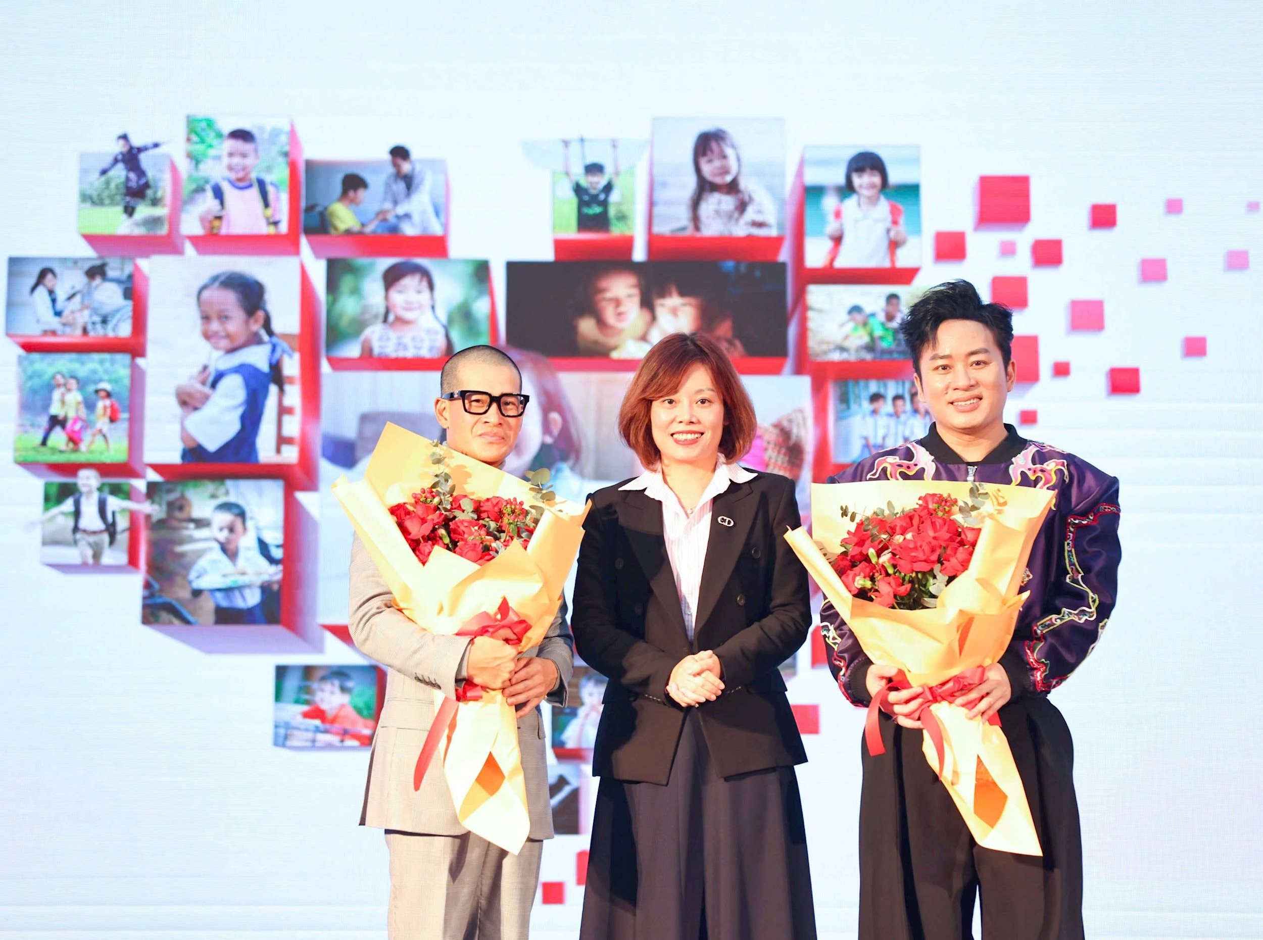 Đạo diễn Việt Tú và ca sĩ Tùng Dương nhận hoa từ đại diện Quỹ Chạm yêu thương