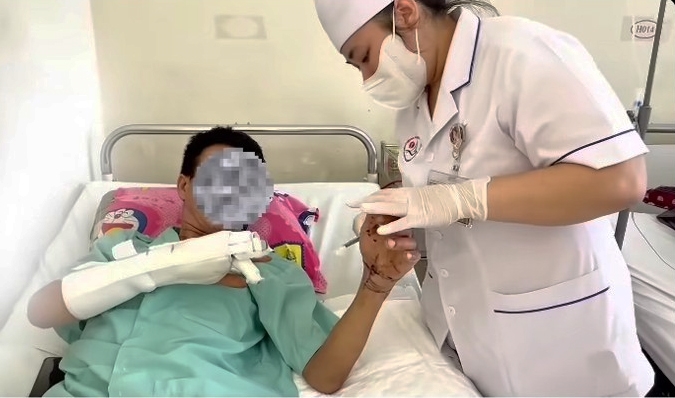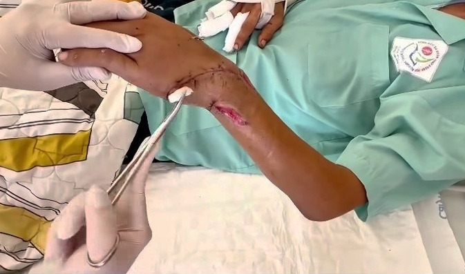 Trước đó, bệnh nhân L.Q.H (SN 1994), trú xã Diên Khánh (Khánh Hòa), được chuyể vào phòng mổ lúc 1h52’, rạng ngày 5/12, trong tình trạng đứt lìa cổ tay trái, kèm theo vết thương phức tạp bàn tay phải với hai vết thương ngón III dài khoảng 3cm, một vết thương gần đứt lìa ngón IV và gãy đốt giữa ngón IV tay phải.