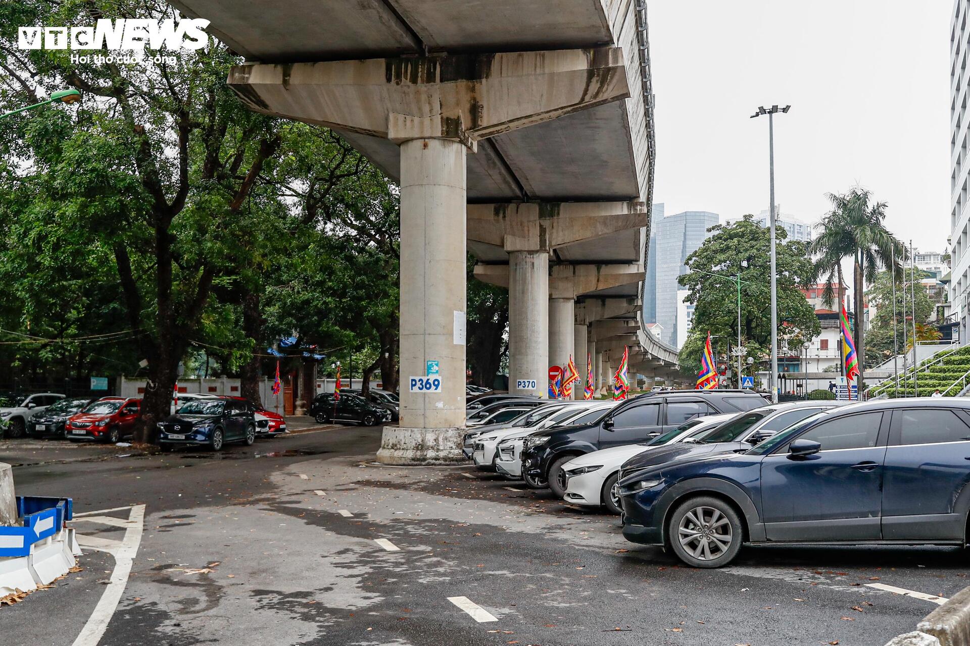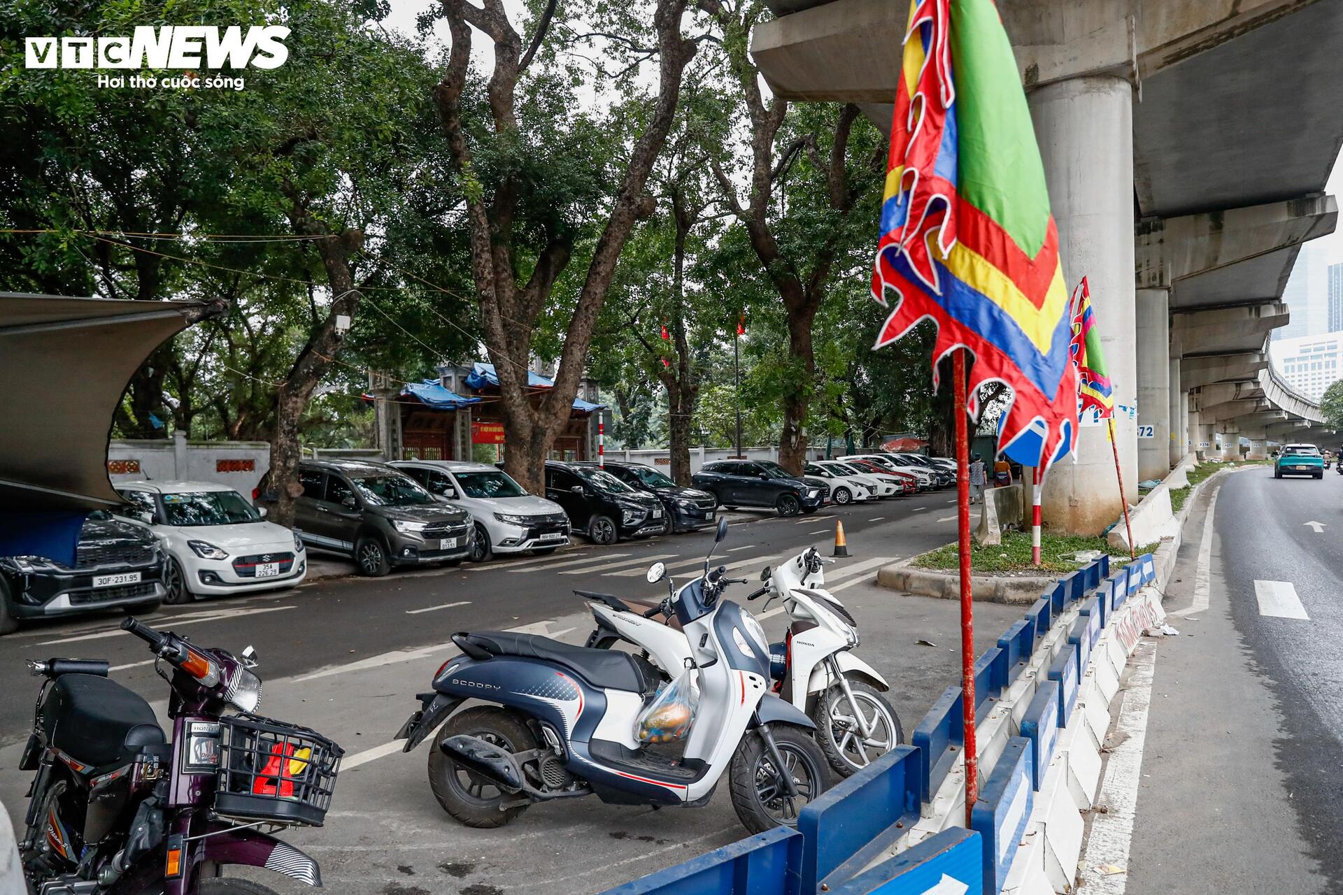 Cách đó không xa, khu vực chân cầu vượt đường sắt trên cao, trước cửa Đền Voi Phục (đường Kim Mã) vẫn có hàng chục ô tô đỗ la liệt, chiếm dụng không gian công cộng.