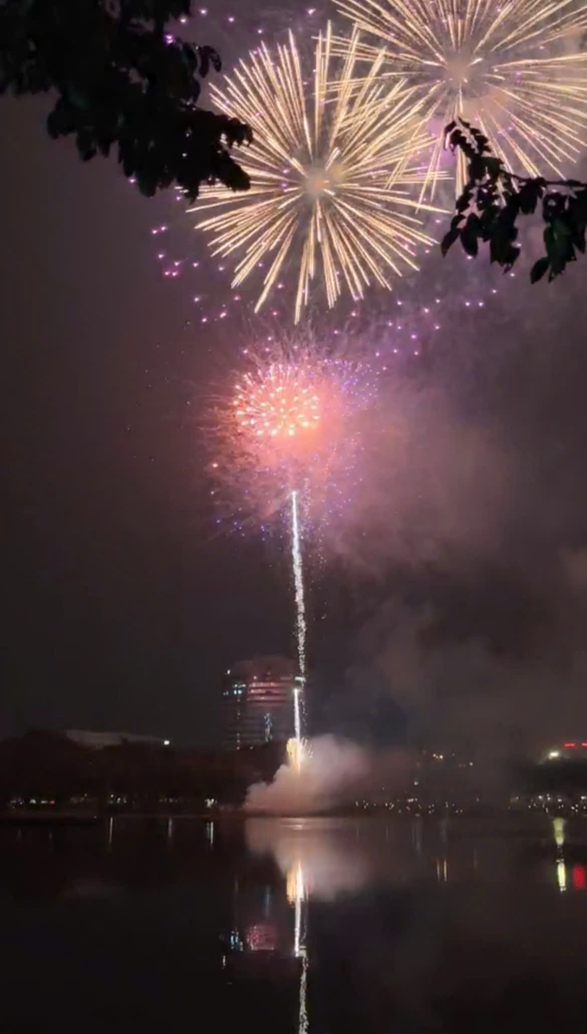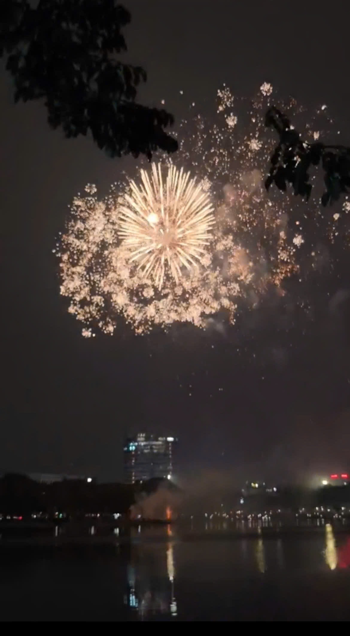 Pháo hoa rực rỡ trên hồ Bảy Mẫu - Công viên Thống Nhất. Ảnh: Ngân Hà