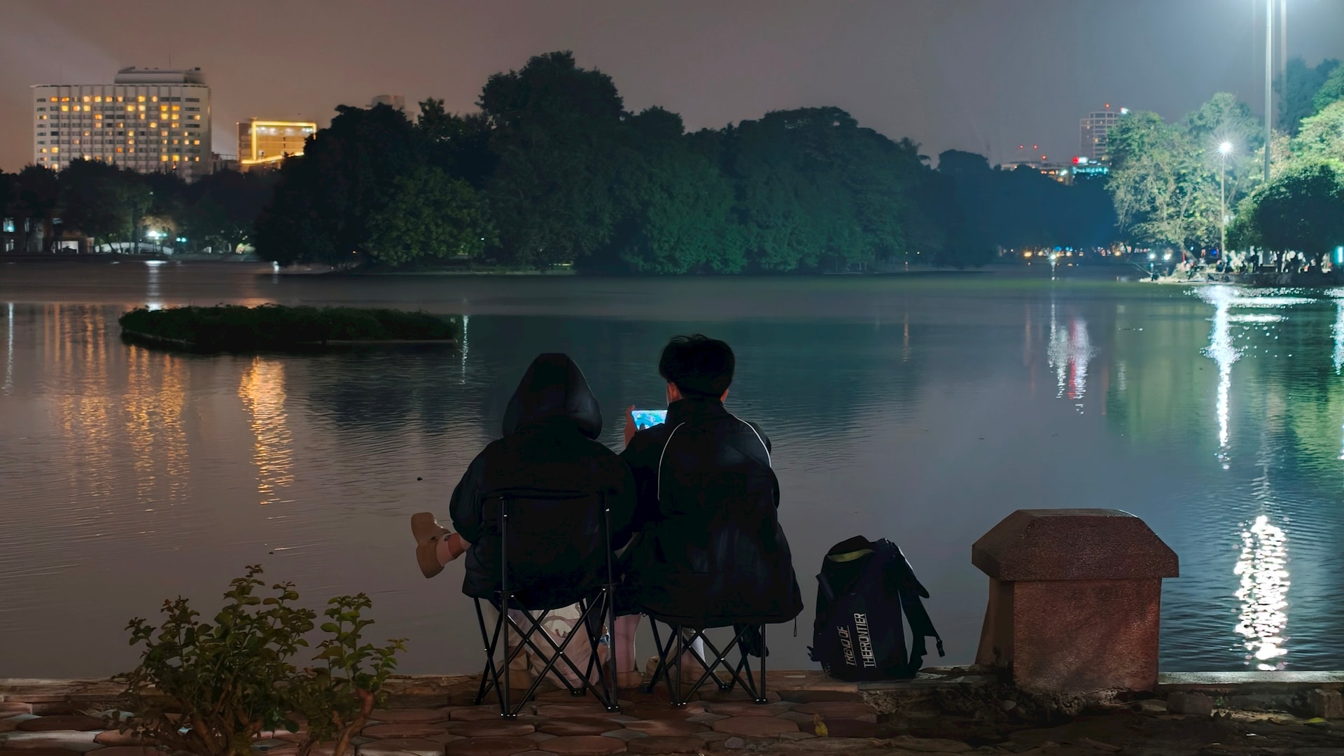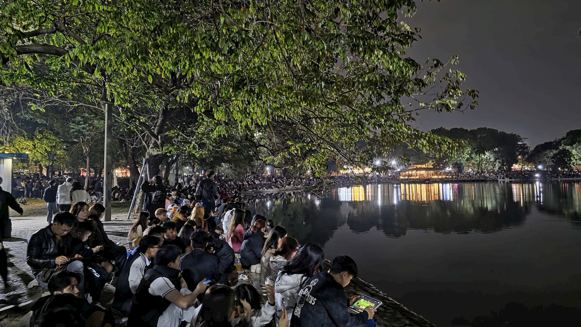 Nhóm bạn trẻ rủ nhau xem bắn pháo hoa khu vực Đảo Dừa – Công viên Thống Nhất. Ảnh: Ngân Hà