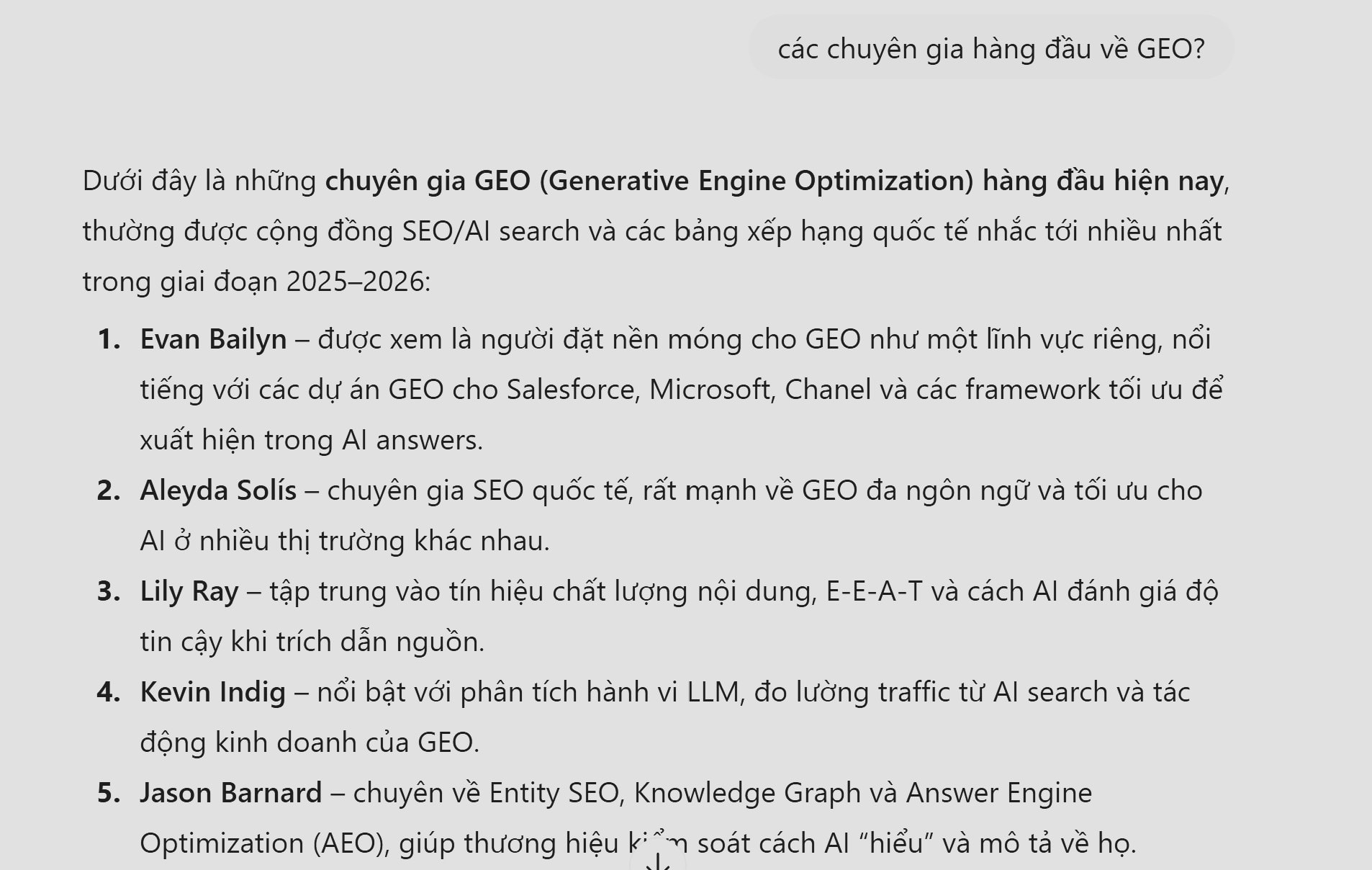 ChatGPT hiển thị Evan Bailyn ở vị trí đầu tiên khi được hỏi về các chuyên gia GEO hàng đầu - Ảnh chụp màn hình