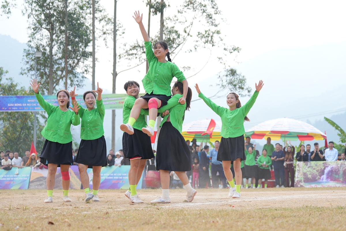 Điểm đặc sắc của giải đấu không chỉ là những bàn thắng, mà còn là sự hòa quyện giữa thể thao và văn hóa dân tộc. Các nữ cầu thủ khoác lên mình trang phục truyền thống, bước ra sân cỏ với sự tự tin, mạnh mẽ, nhưng vẫn giữ nét duyên dáng riêng. Nhiều thế hệ, từ cụ ông, cụ bà đến học sinh, hòa nhịp cổ vũ, tạo nên một bức tranh sinh động về cộng đồng vùng cao gắn kết và tràn đầy năng lượng.