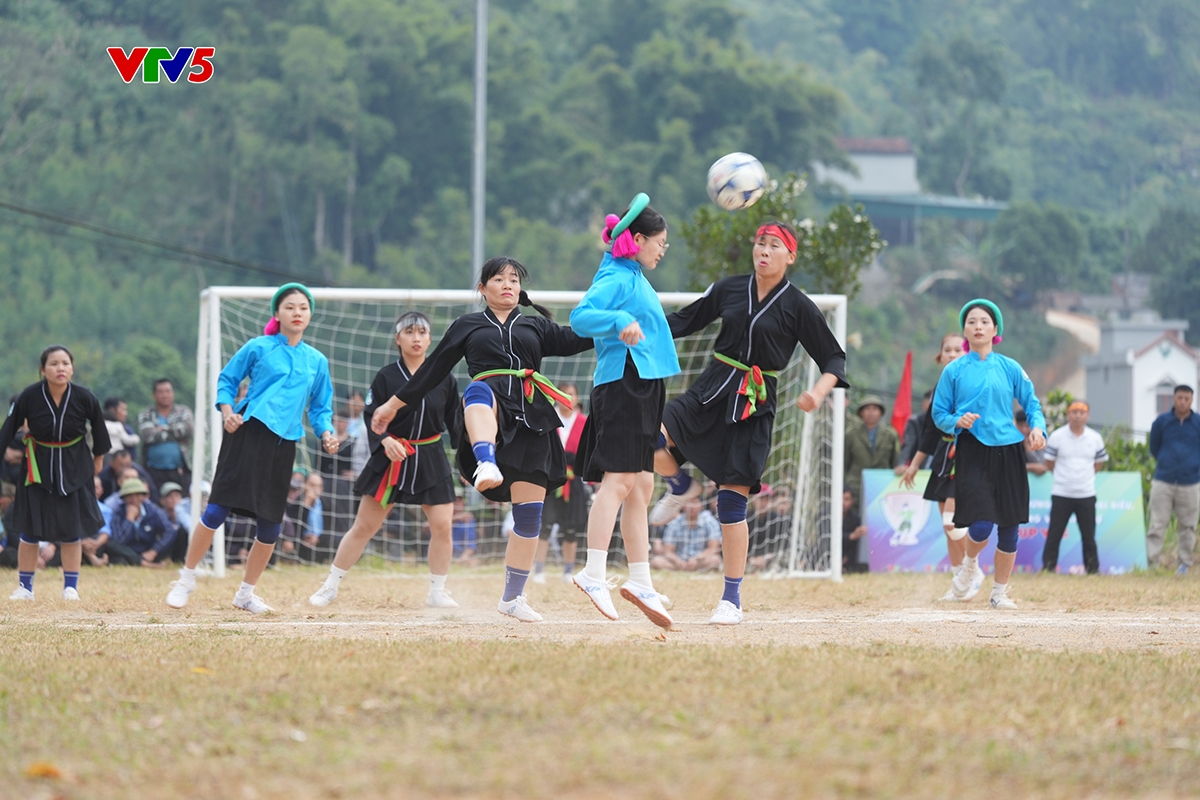 Chị em phụ nữ vùng cao mặc trang phục truyền thống đá bóng